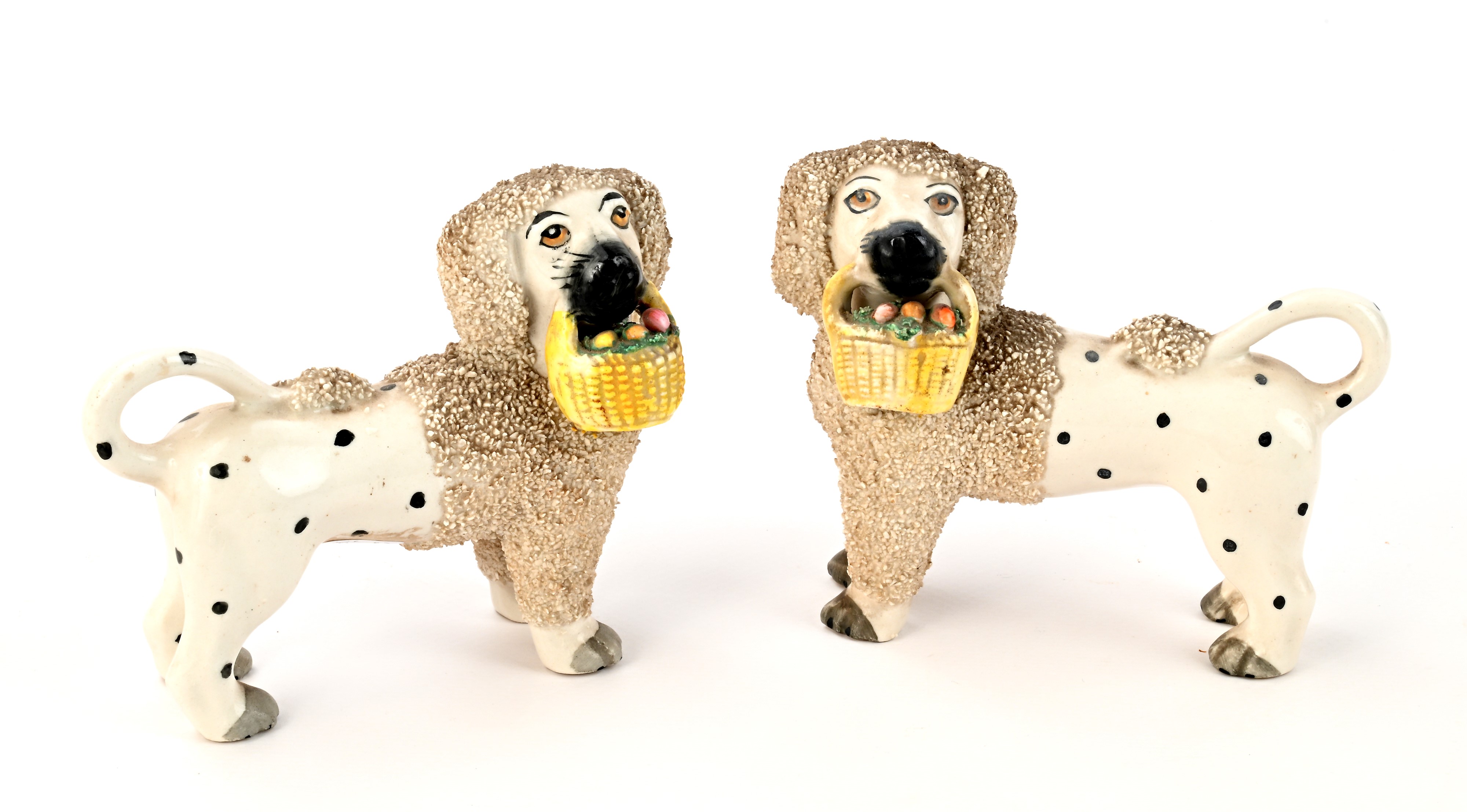 Coppia di barbonicini con cesto di frutta e manto maculato, Inghilterra, Staffordshire, inizi del XX secolo