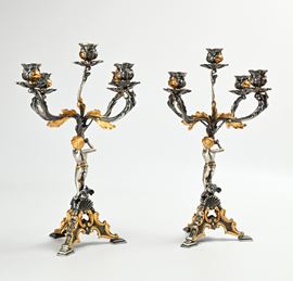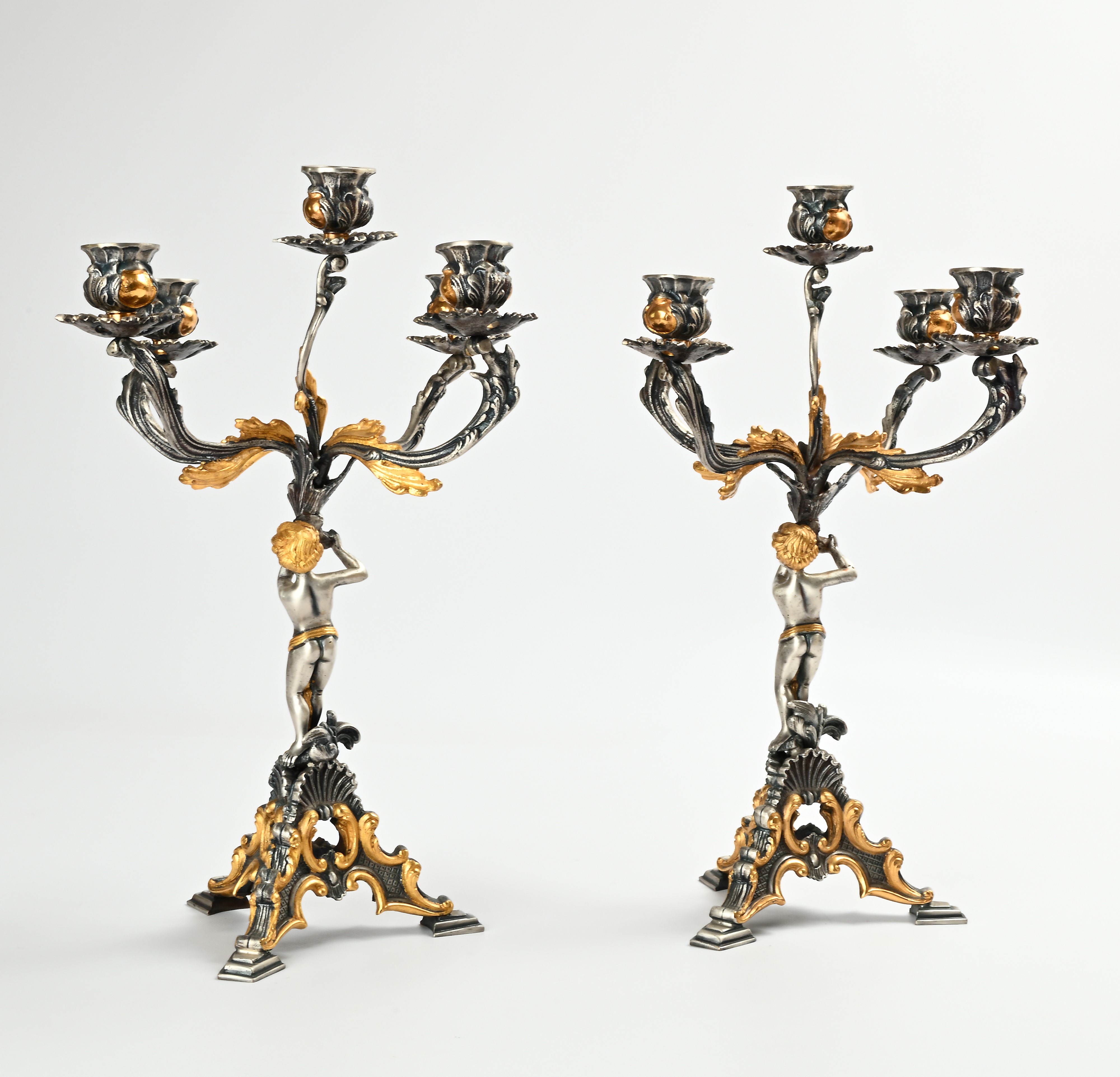 Coppia di candelabri in lega metallica a patina argentata e in parte dorata, cinque luci con figure di amorino su base tripode