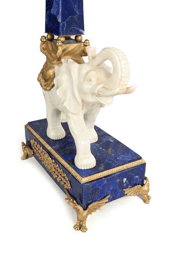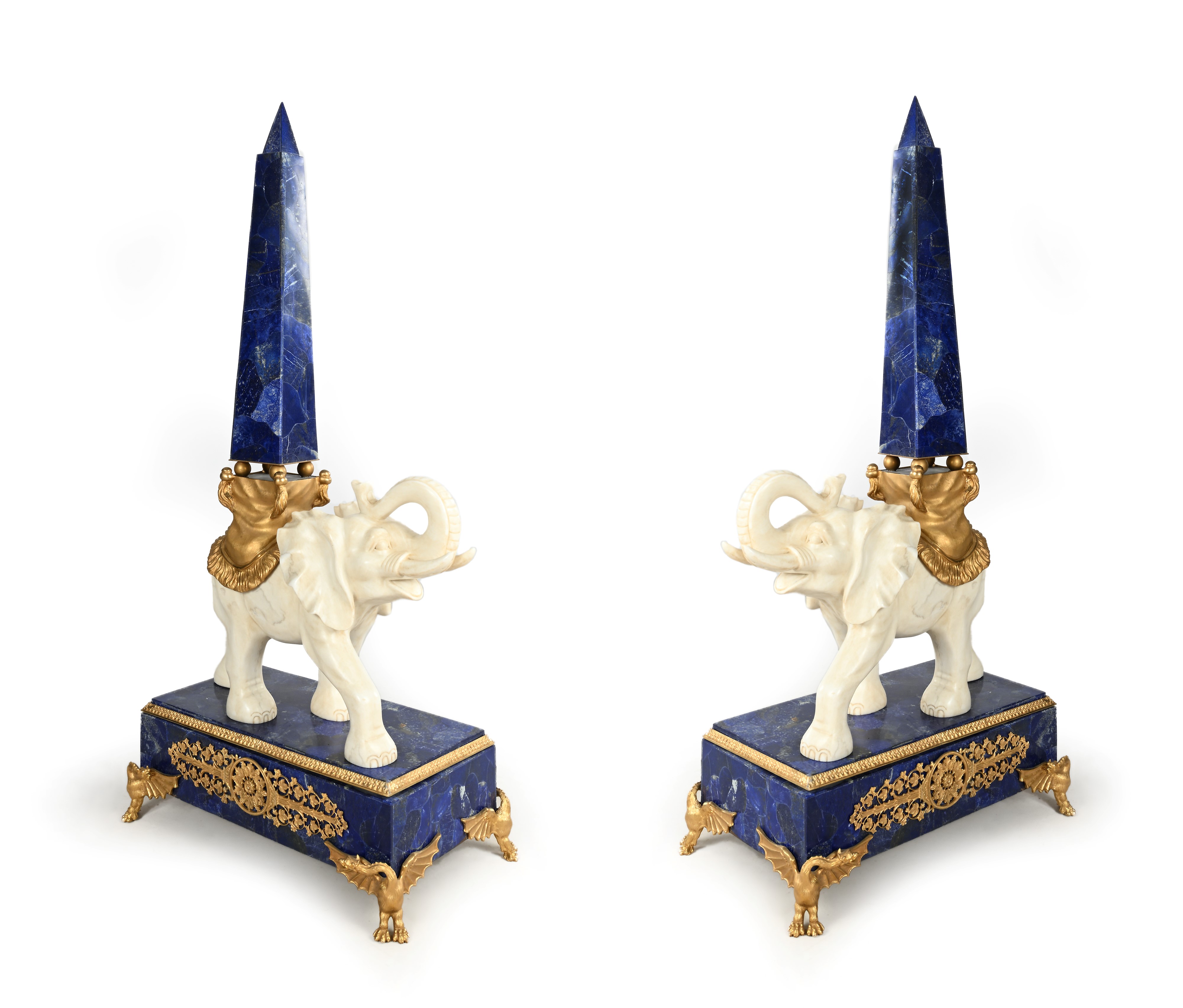 Coppia di grandi obelischi in lapislazuli su elefanti in marmo bianco, Francia, fine regno Napoleone III