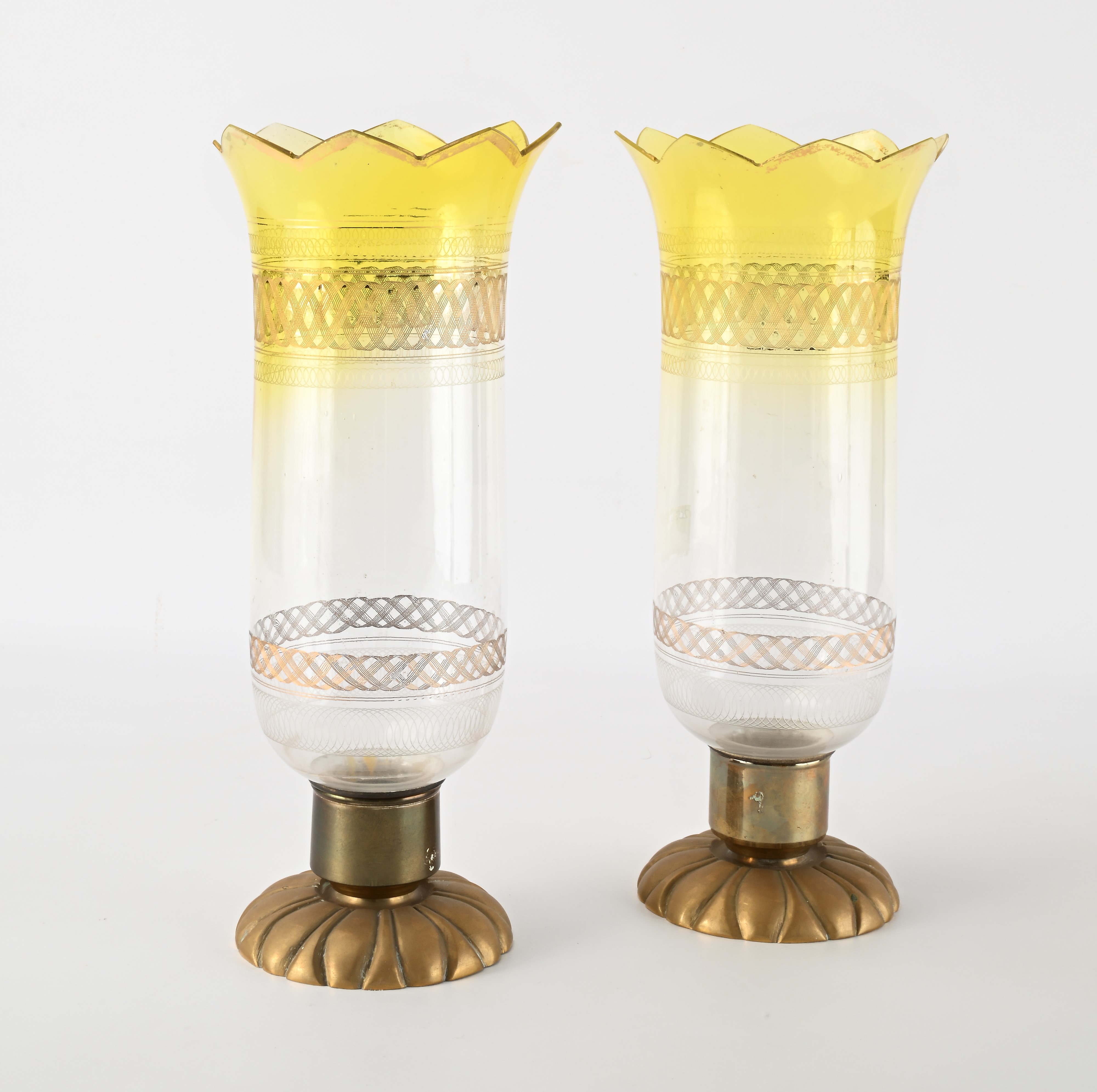 Coppia di portacandela "photophores" in ottone e cristallo, fine del XIX/inizi del XX secolo