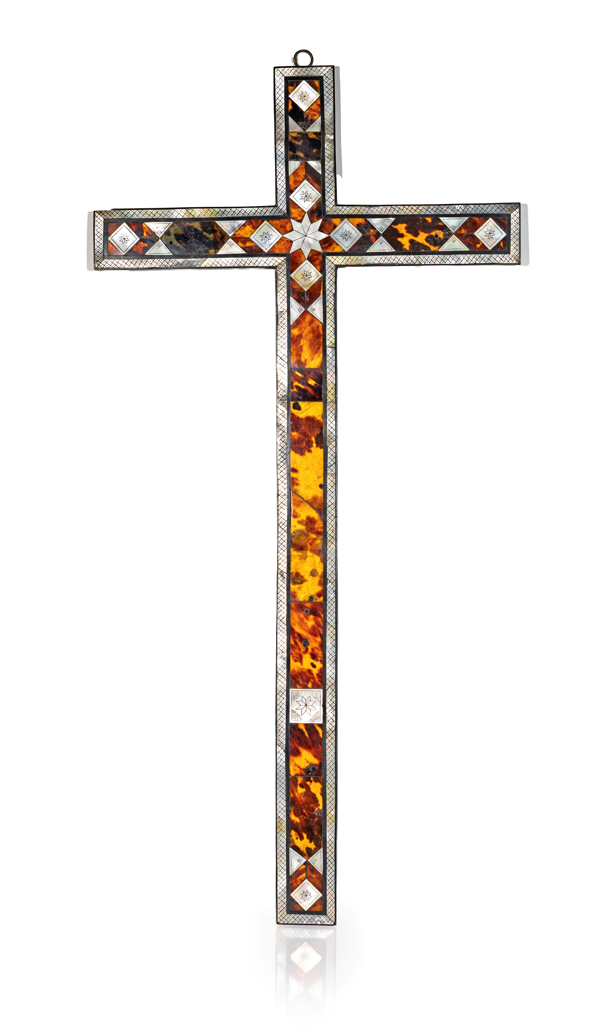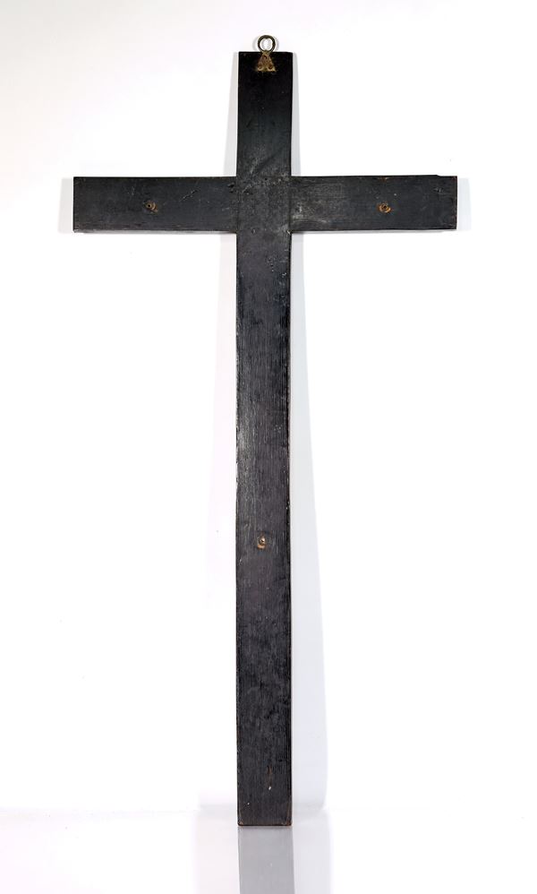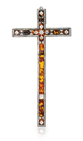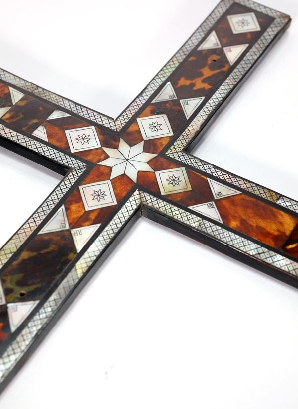 Croce devozionale in tartaruga, legno ebanizzato e inserti di madreperla, XIX secolo