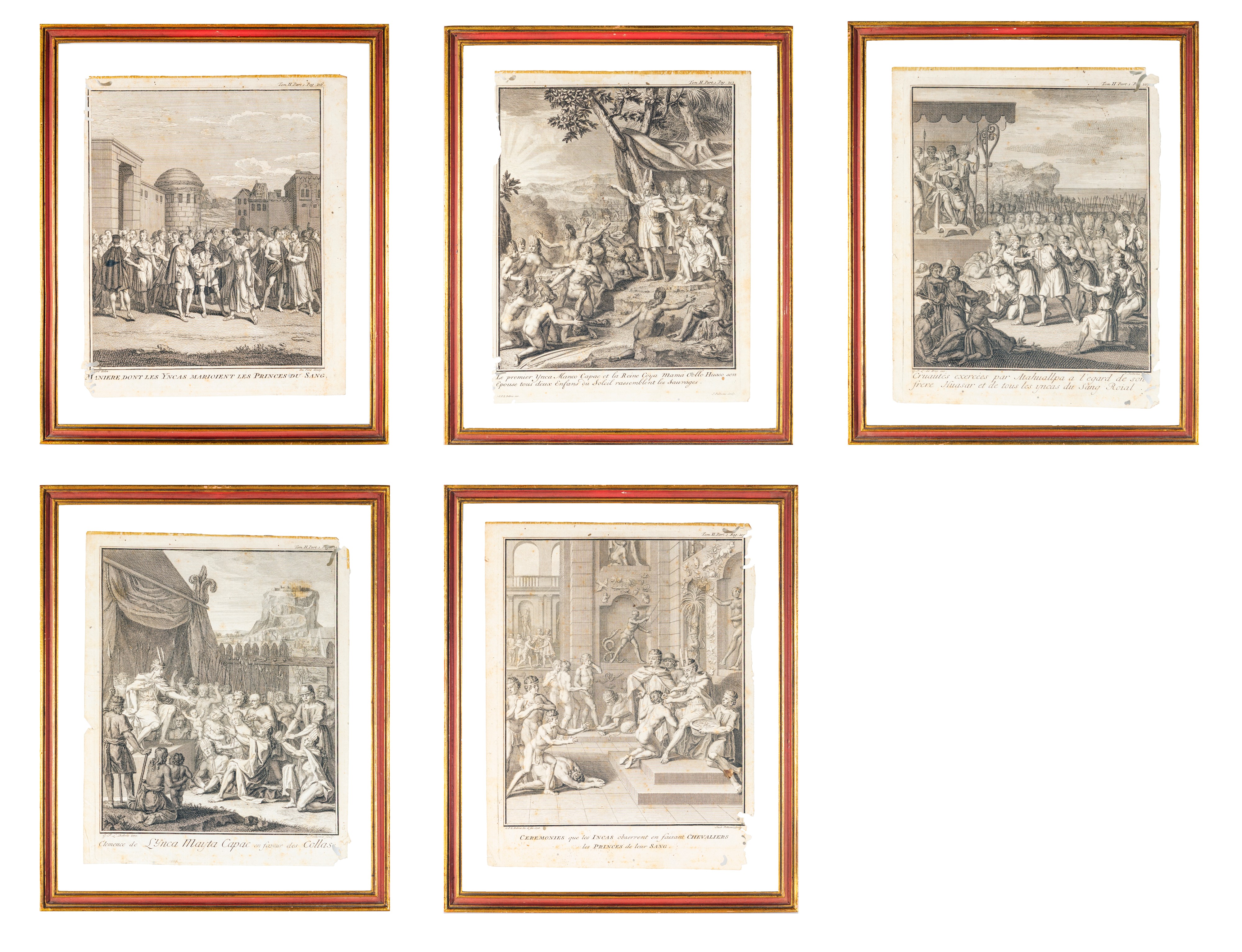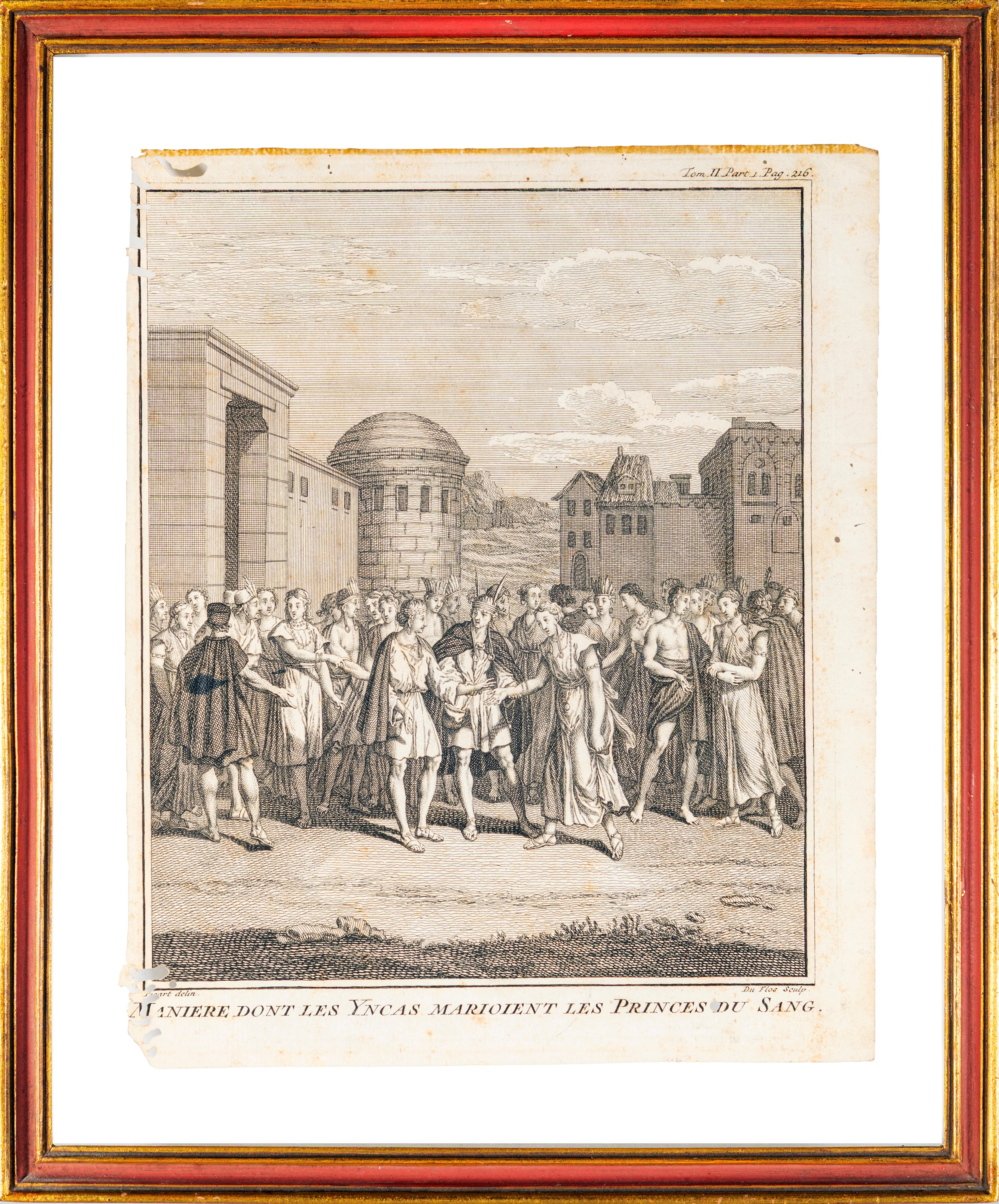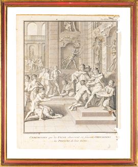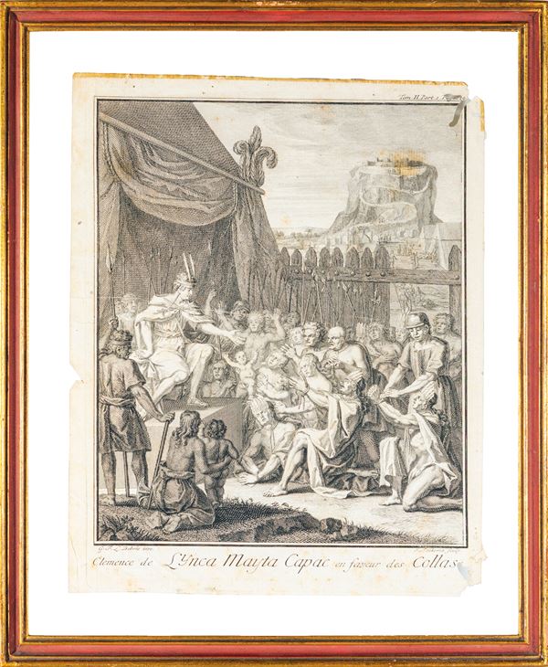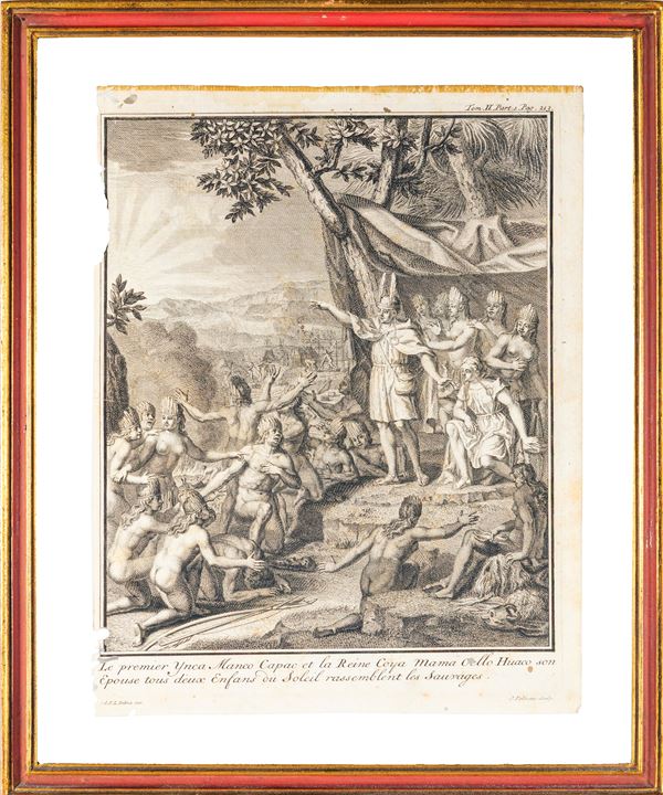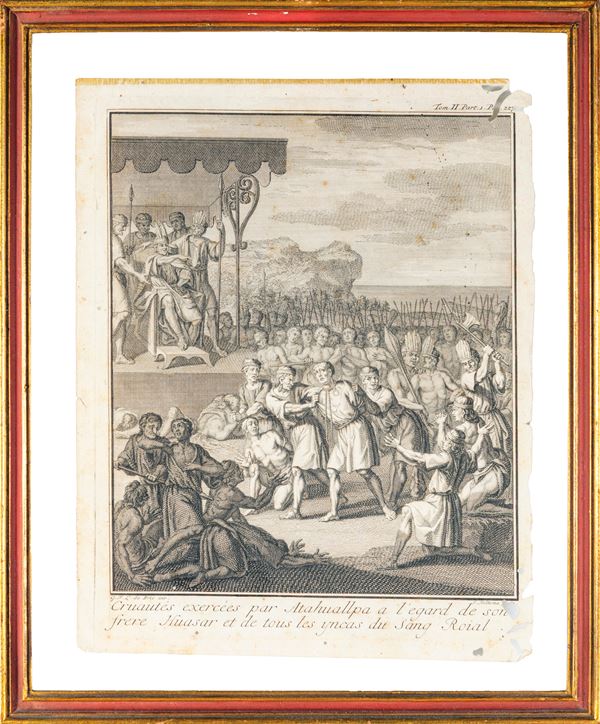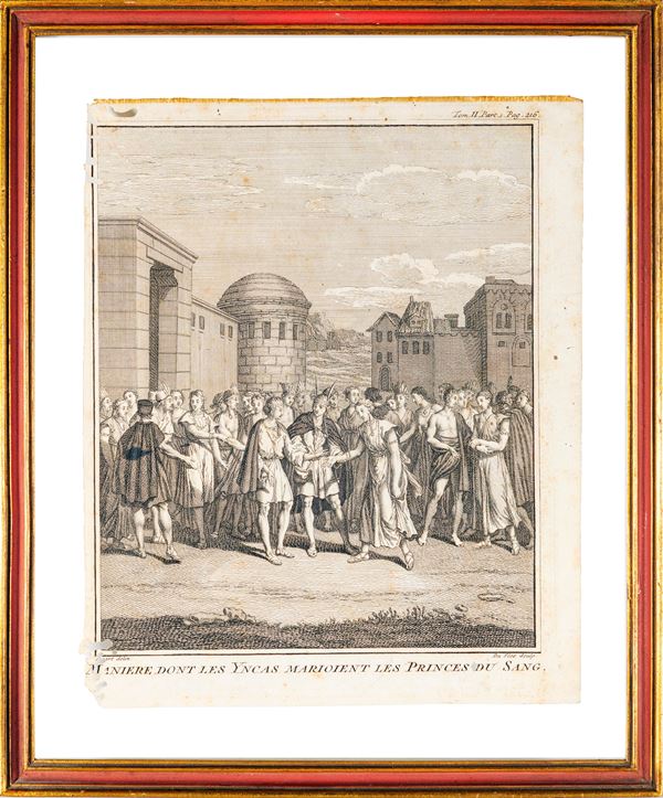 tratte da Storia generale dei paesi e dei popoli dell'America "Viaggio storico nell'America Meridionale effettuato per ordine del Re di Spagna" (1752); una raffigurante matrimonio Incas, incisa da Claude Duflos (Parigi 1665 - Parigi 1727) su disegno di Bernard Picard (1673 - 1733). Difetti alla carta