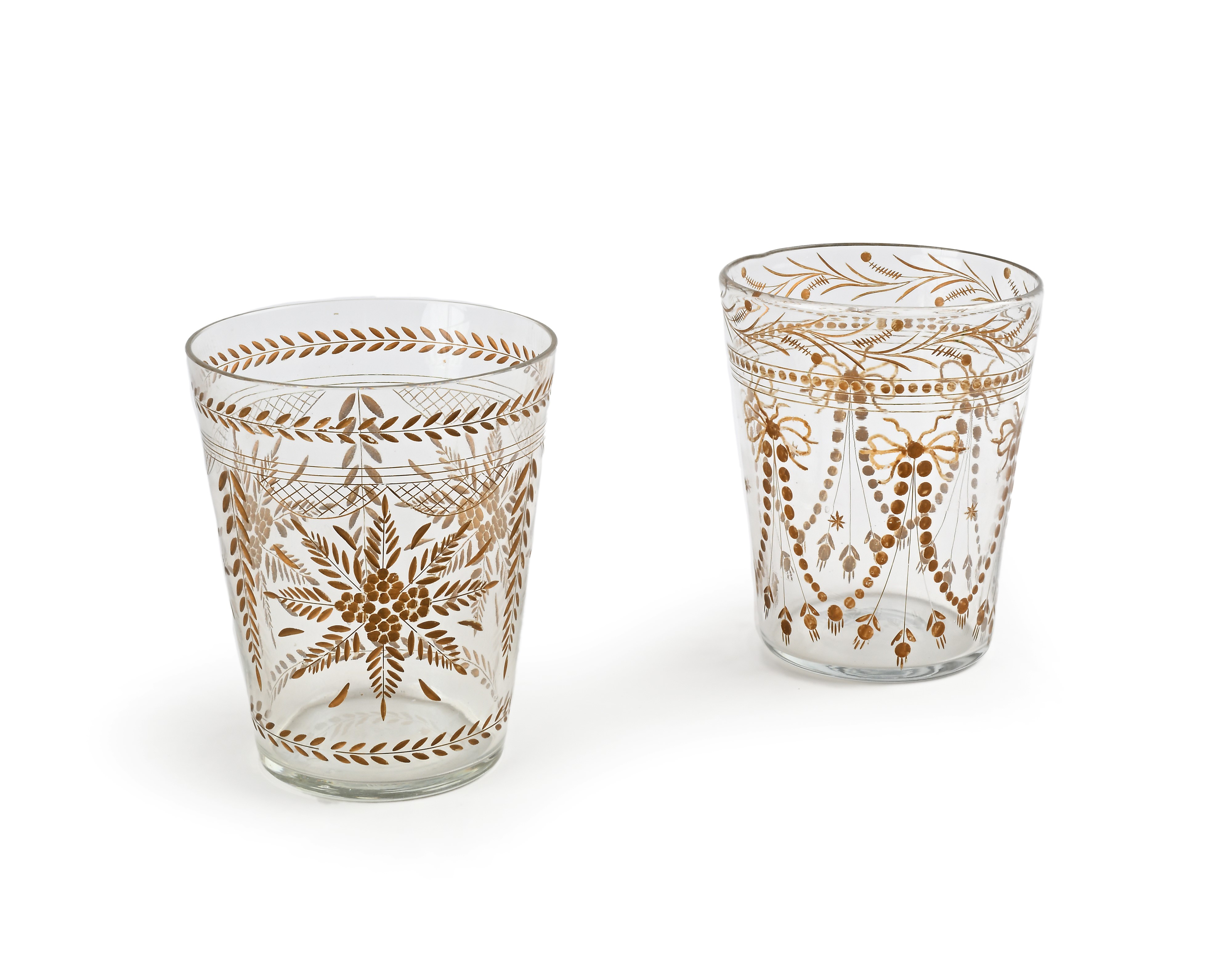 Due rinfrescatoi simili in vetro con decorazione molata e dorata, inizi XX secolo