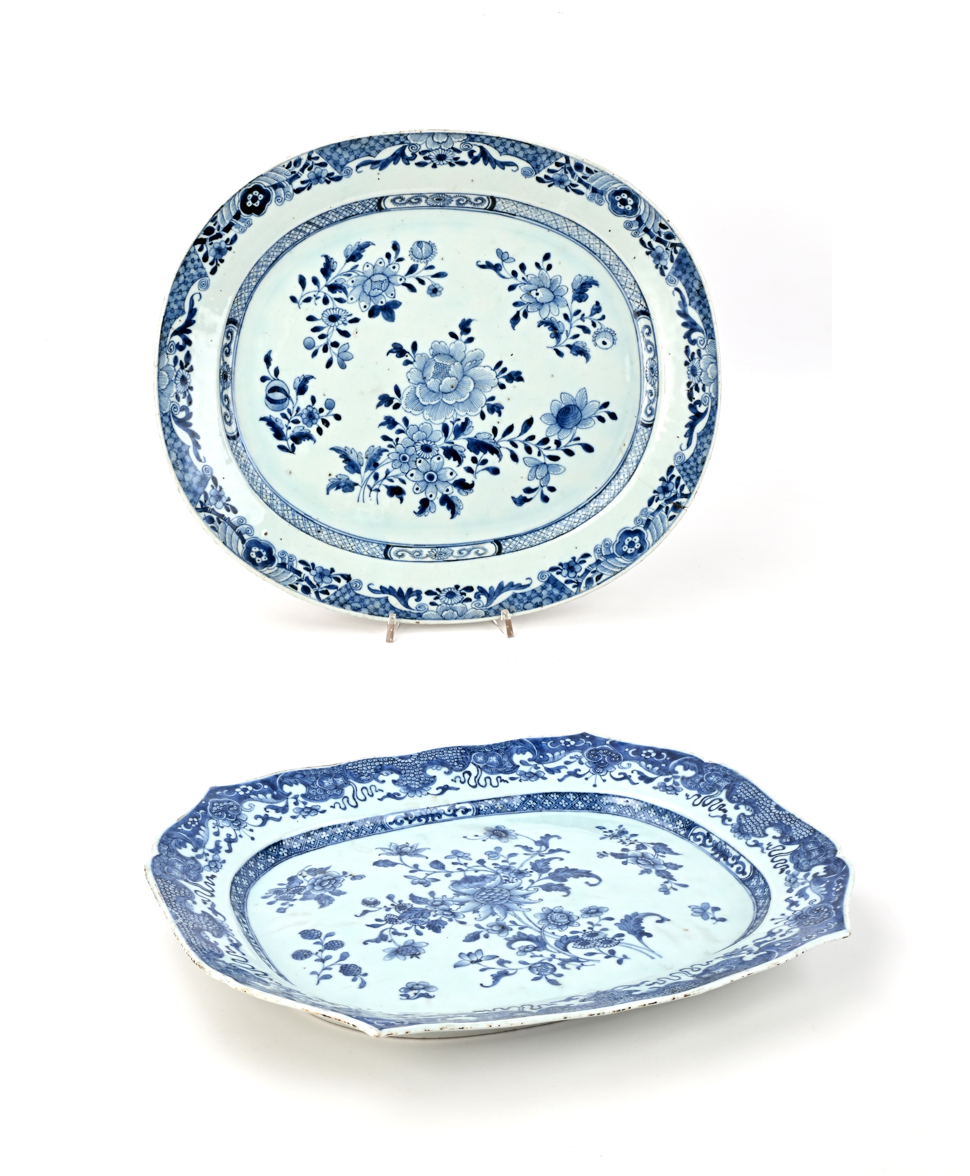 Due vassoi diversi in porcellana bianca e blu, Compagnia delle Indie, XVIII secolo