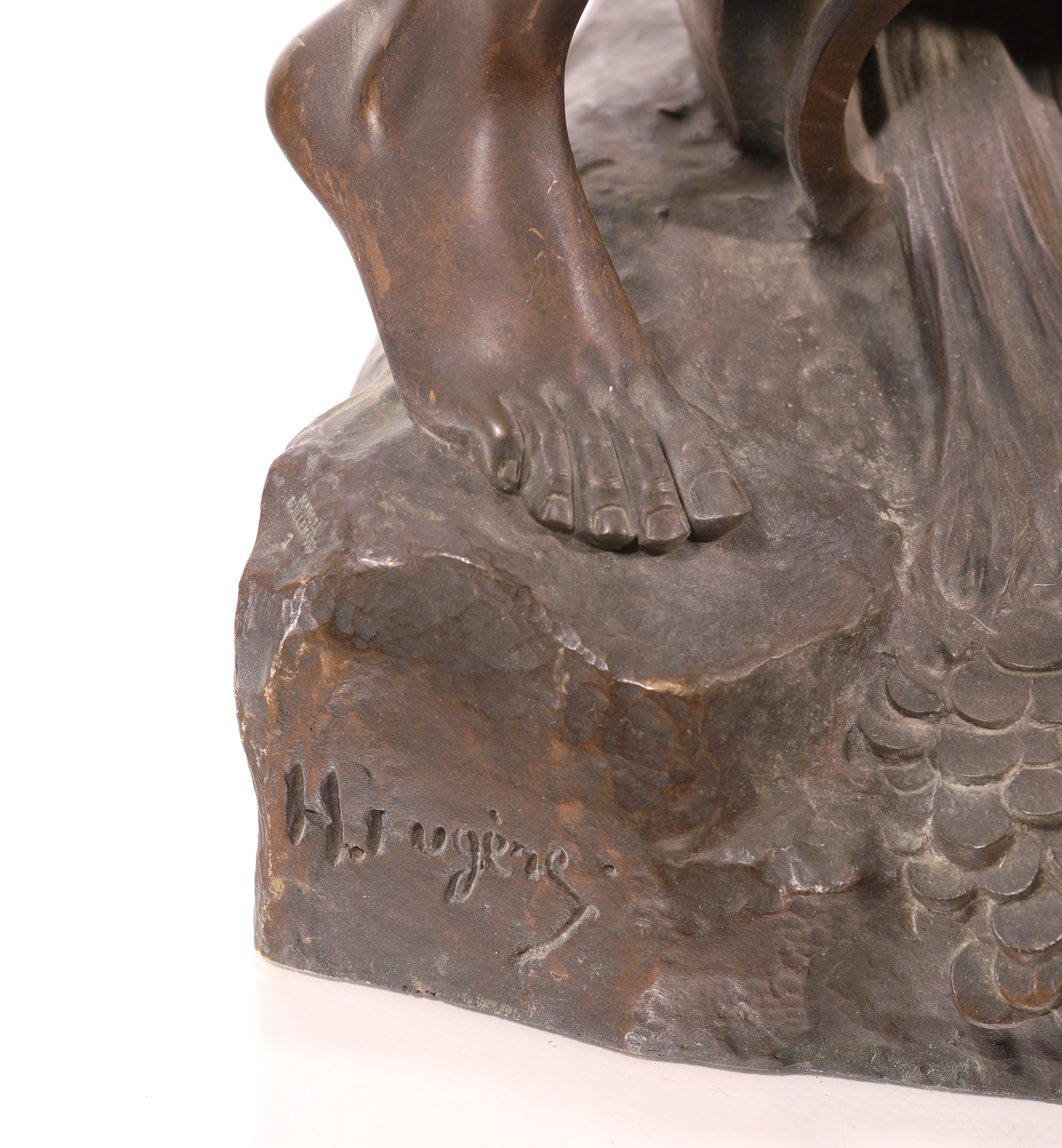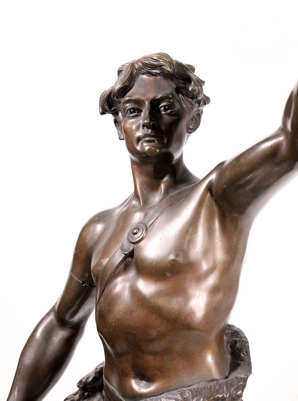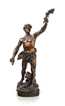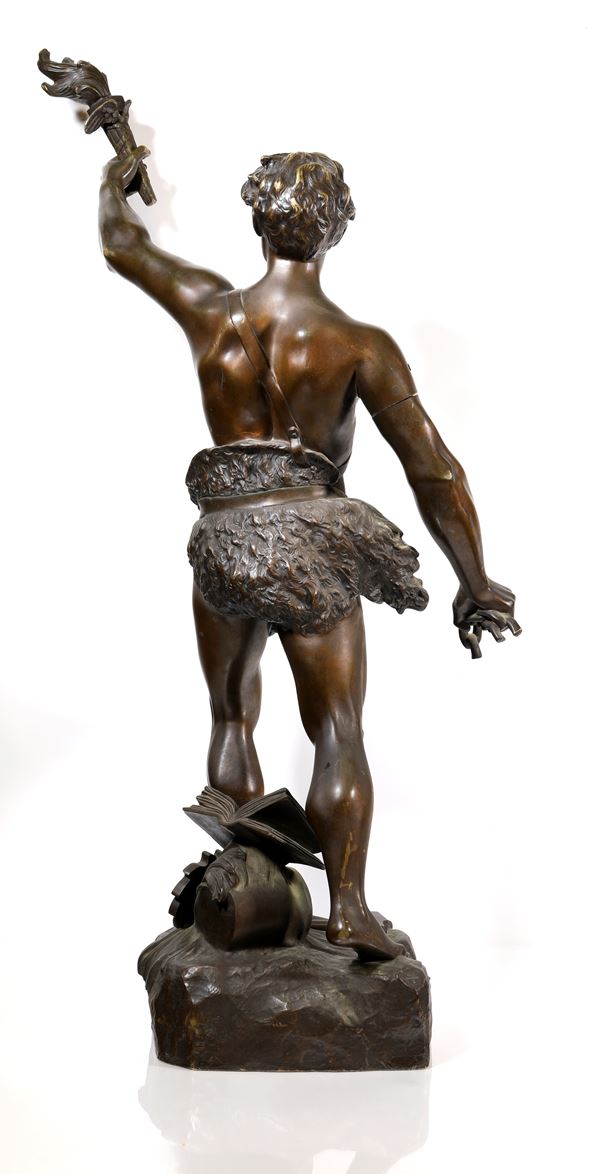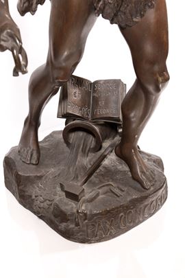 figura virile allegorica rappresentata con fiaccola sollevata nella mano sinistra e catena spezzata trattenuta nella destra; ai piedi un martello ed un vaso ad urna da cui fuoriesce acqua su cui poggia un libro aperto con iscrizione francese "lavoro e progresso fonte inesauribile e feconda". Sulla parte frontale della base, iscrizione "Pax Concordia". Firmata sul lato destro della base: H. Fugère