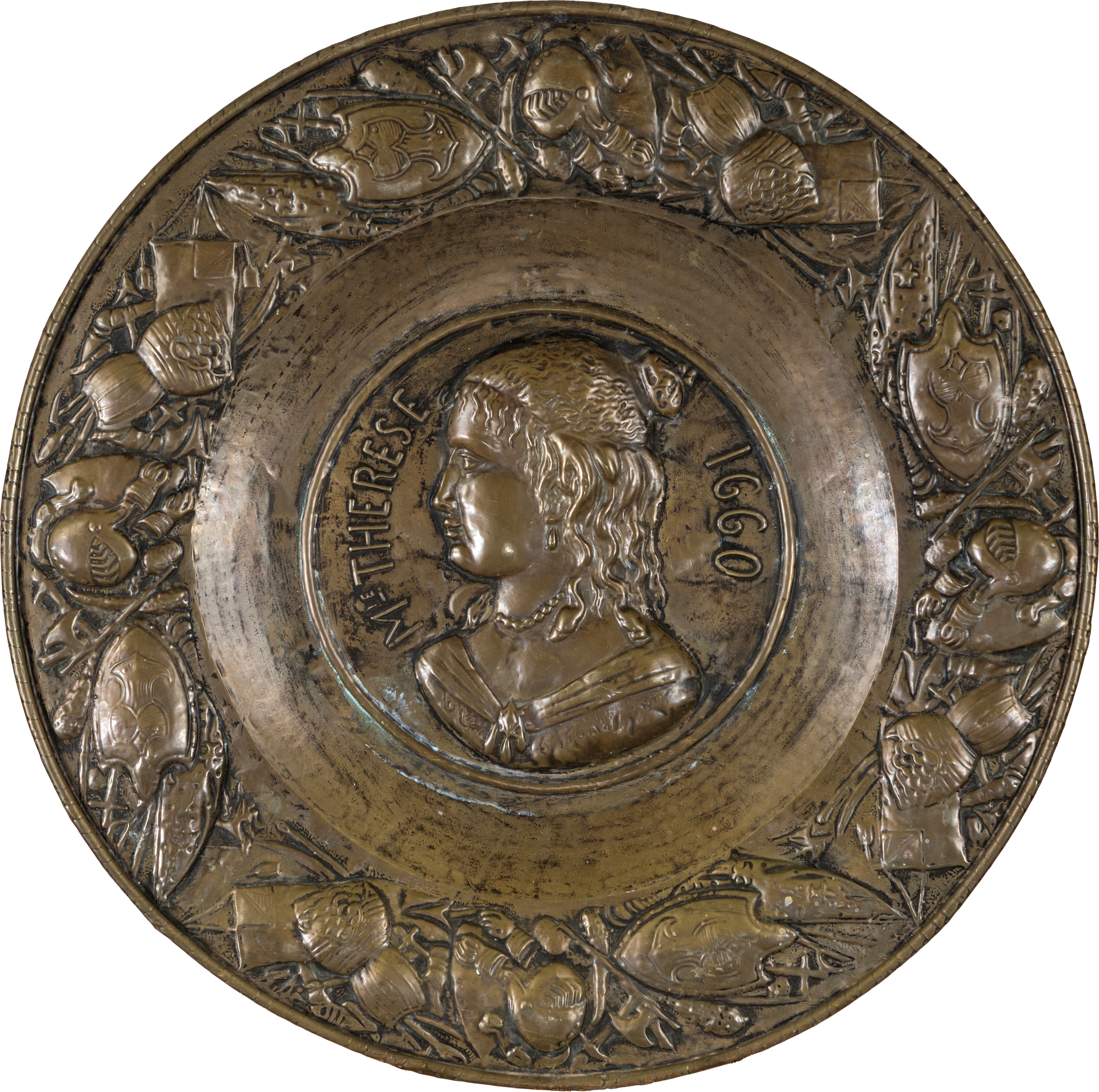al centro ritratto di Maria Teresa d'Asburgo-Spagna, regina di Francia, con data 1660 riferita all'anno delle nozze con Luigi XIV; ampia tesa percorsa da panoplie d'armi