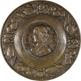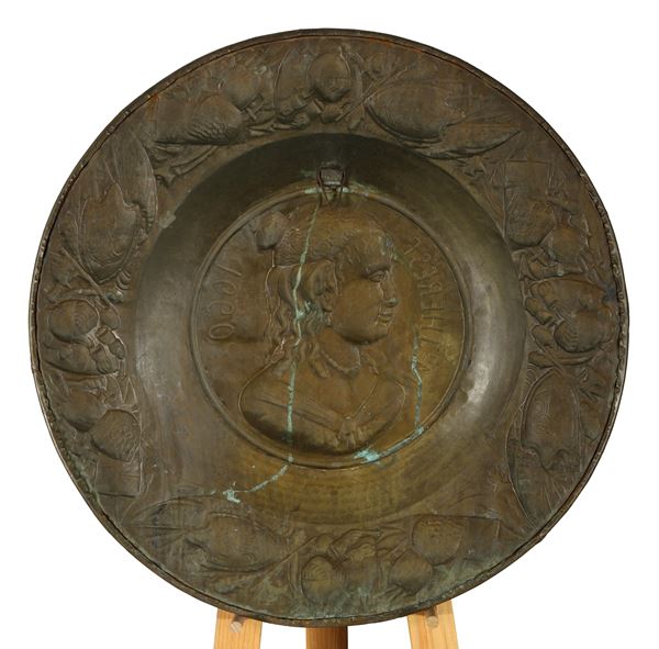 Grande piatto da parata commemorativo in rame repoussé, Francia, XIX secolo