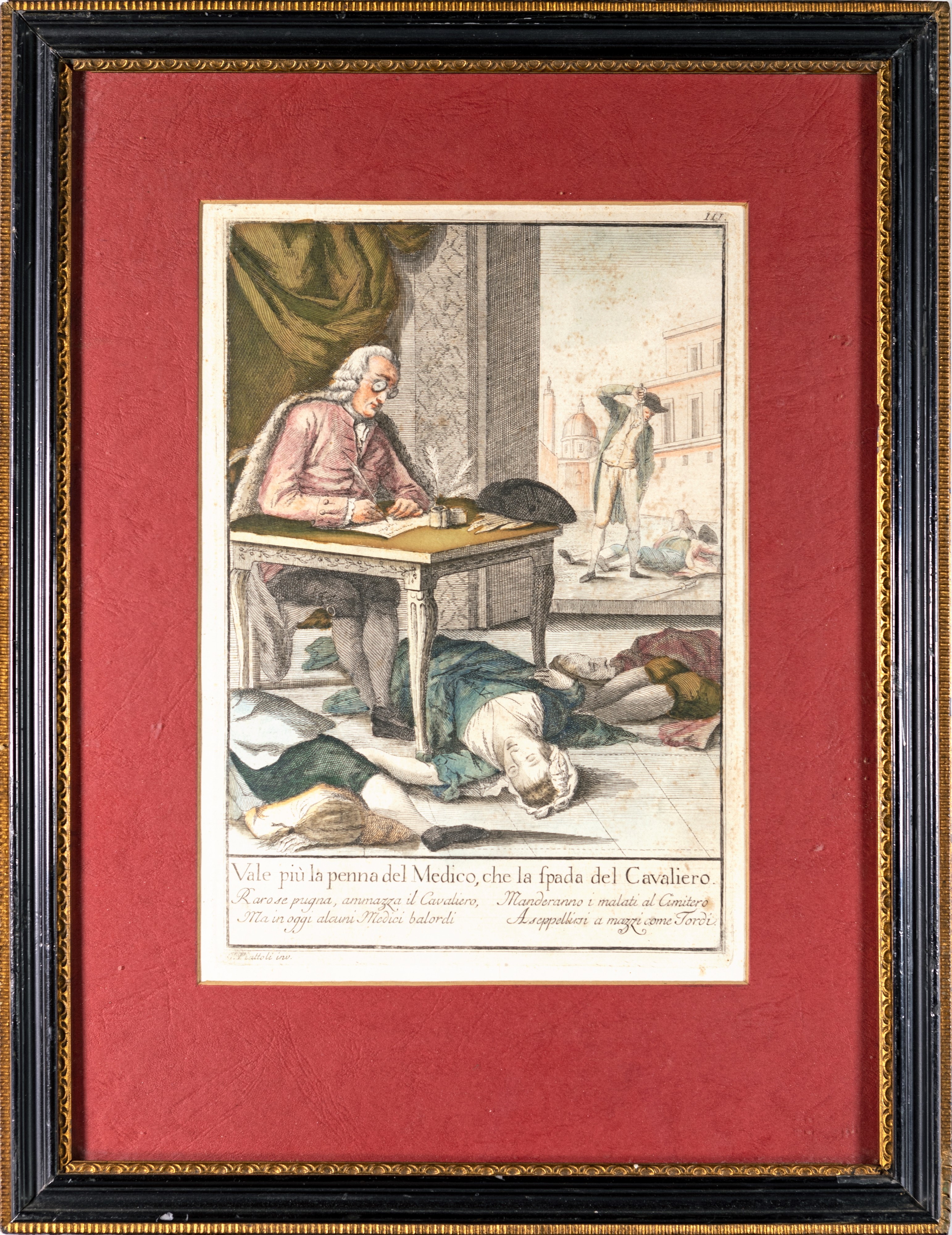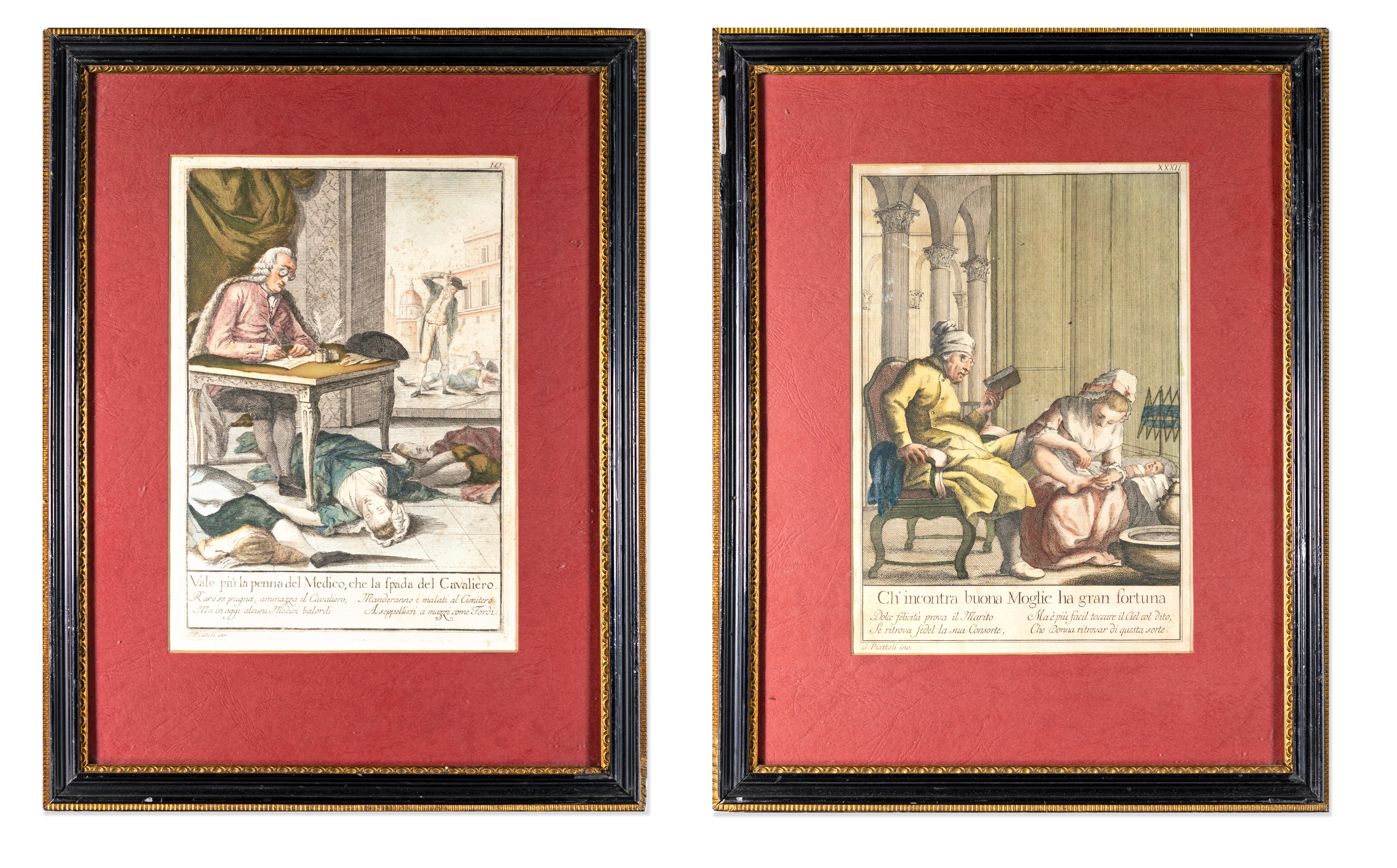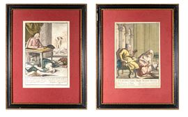 Coppia di incisioni satiriche in cornice, fine del XVIII secolo