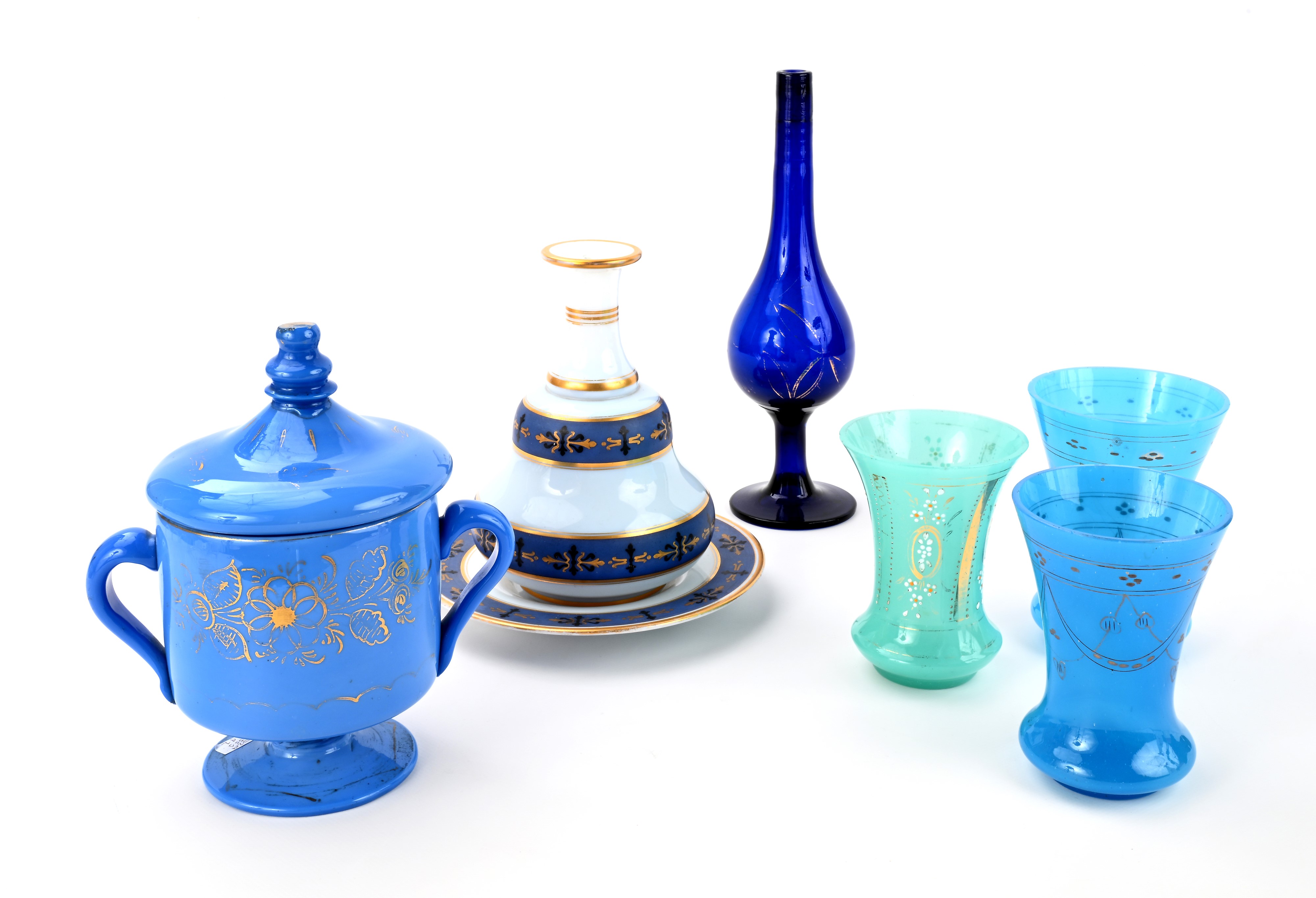 bottiglia con piatto in vetro bianco decorata in oro su fascia blu cobalto (altezza e diametro cm 19 rispettivamente); tre bicchieri diversi (altezza cm 12, 12,5 e 13,5); una coppa biansata con coperchio (cm 20x18x12 ed una bottiglia in vetro blu (altezza cm 27,5)
