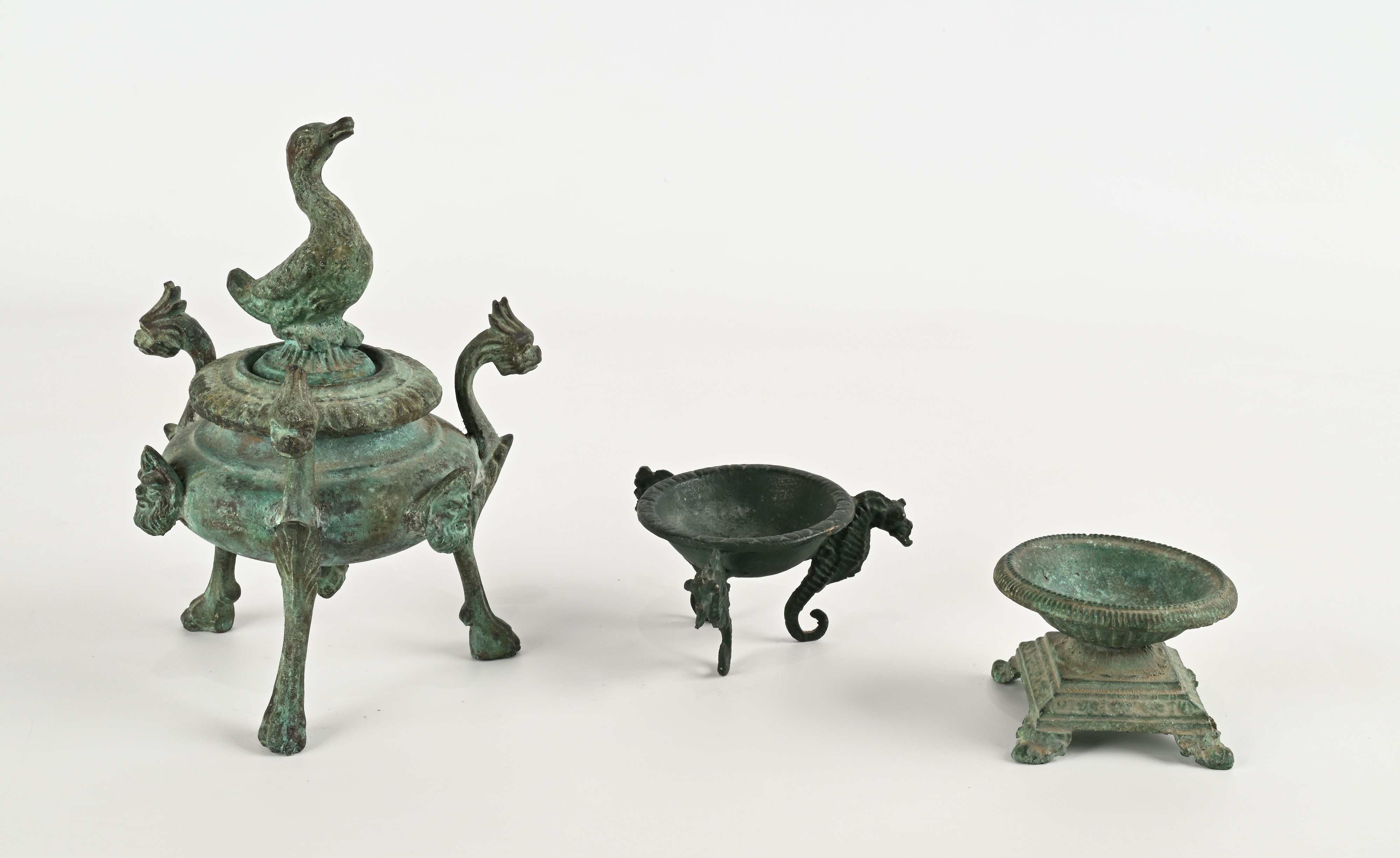 Lotto composto da un bruciaprofumi, un tripode con ippocampi ed una vaschetta - riproduzioni dall'antico