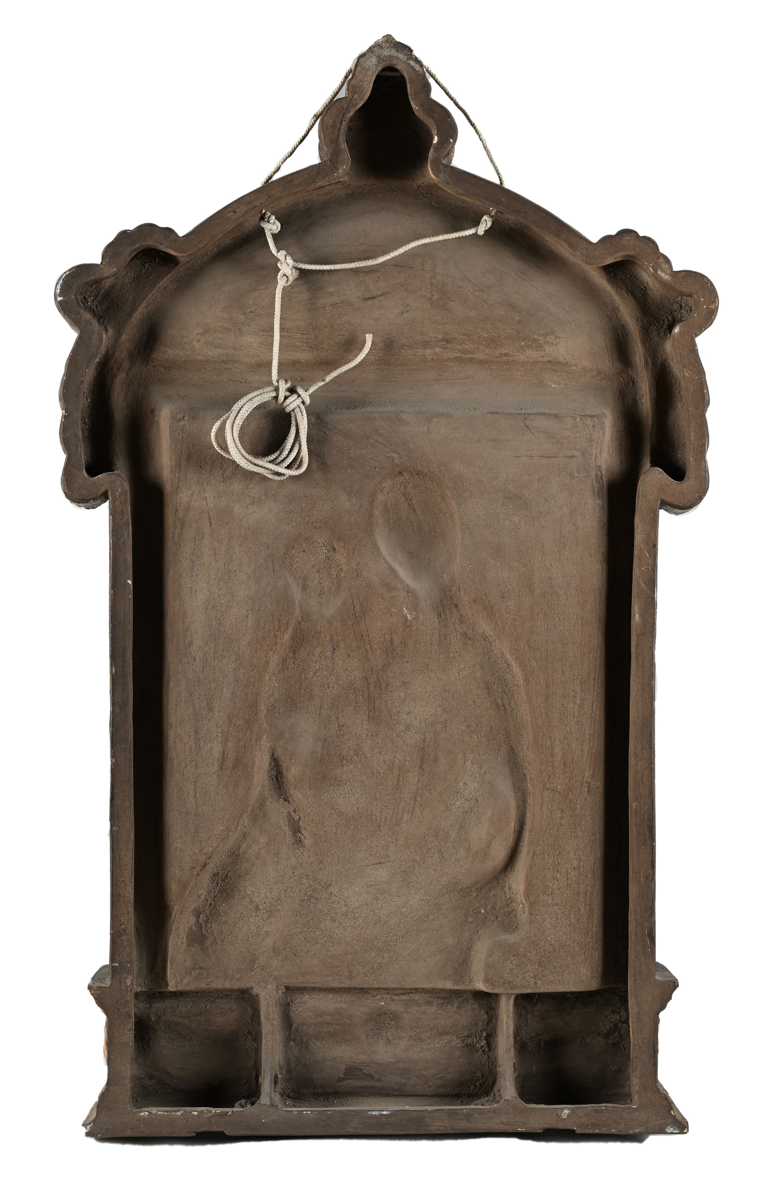 La Vergine è raffigurata seduta all’interno di una edicola architettonica barocca, mentre sorregge tra le braccia il Bambino avvolto in un drappo bianco. Sullo sfondo un paesaggio dipinto e due teste di cherubino. L'esemplare qui presentato presenta numerose analogie con il rilievo originale in marmo, attribuito ad Antonio Gamberelli detto Antonio Rossellino (per il colore dei capelli), (Firenze, 1472-1479), conservato presso l’Ermitage di Leningrado, testimoniando la diffusione e la reinterpretazione di un modello iconografico di grande successo nel Rinascimento italiano
