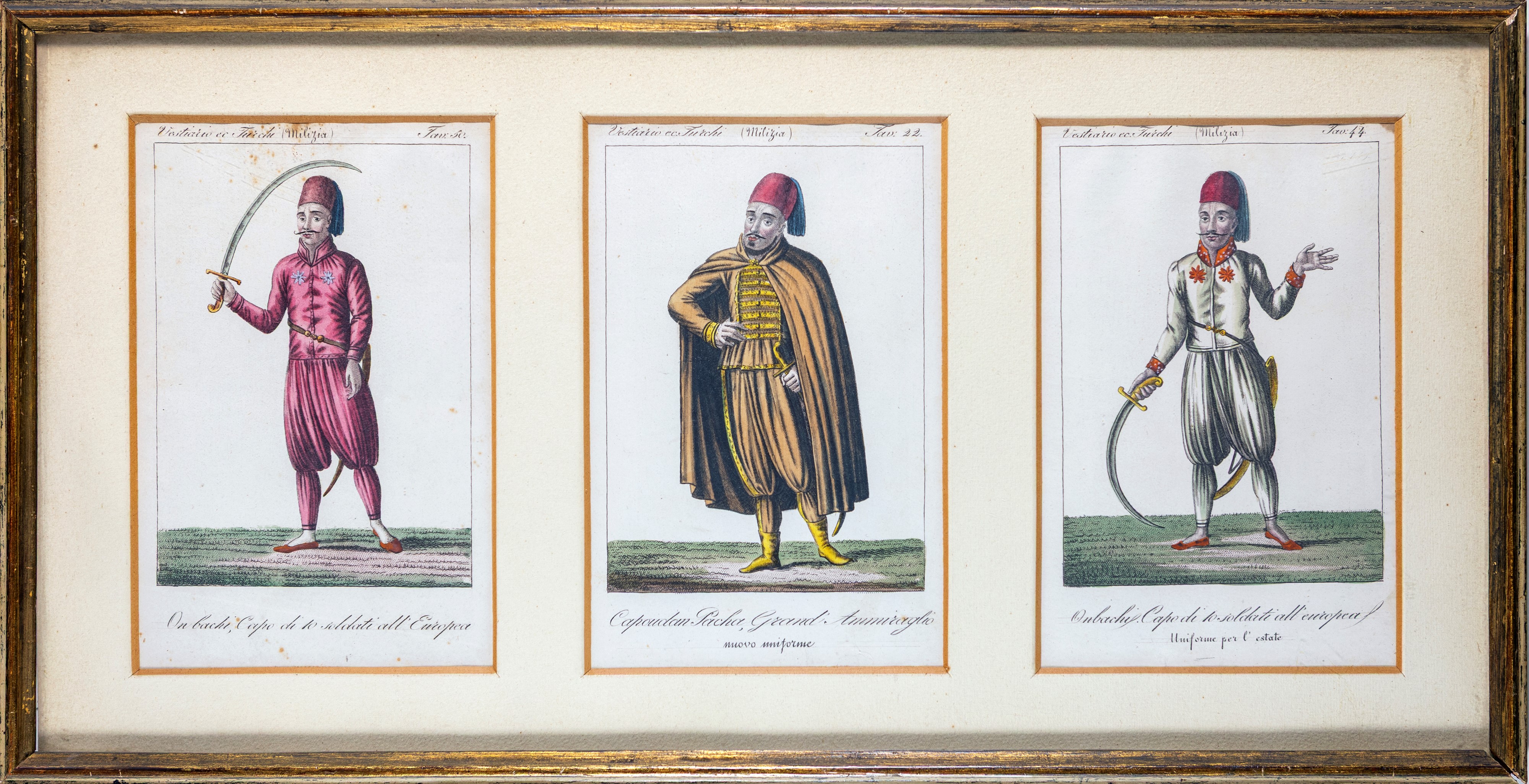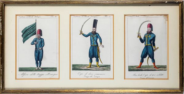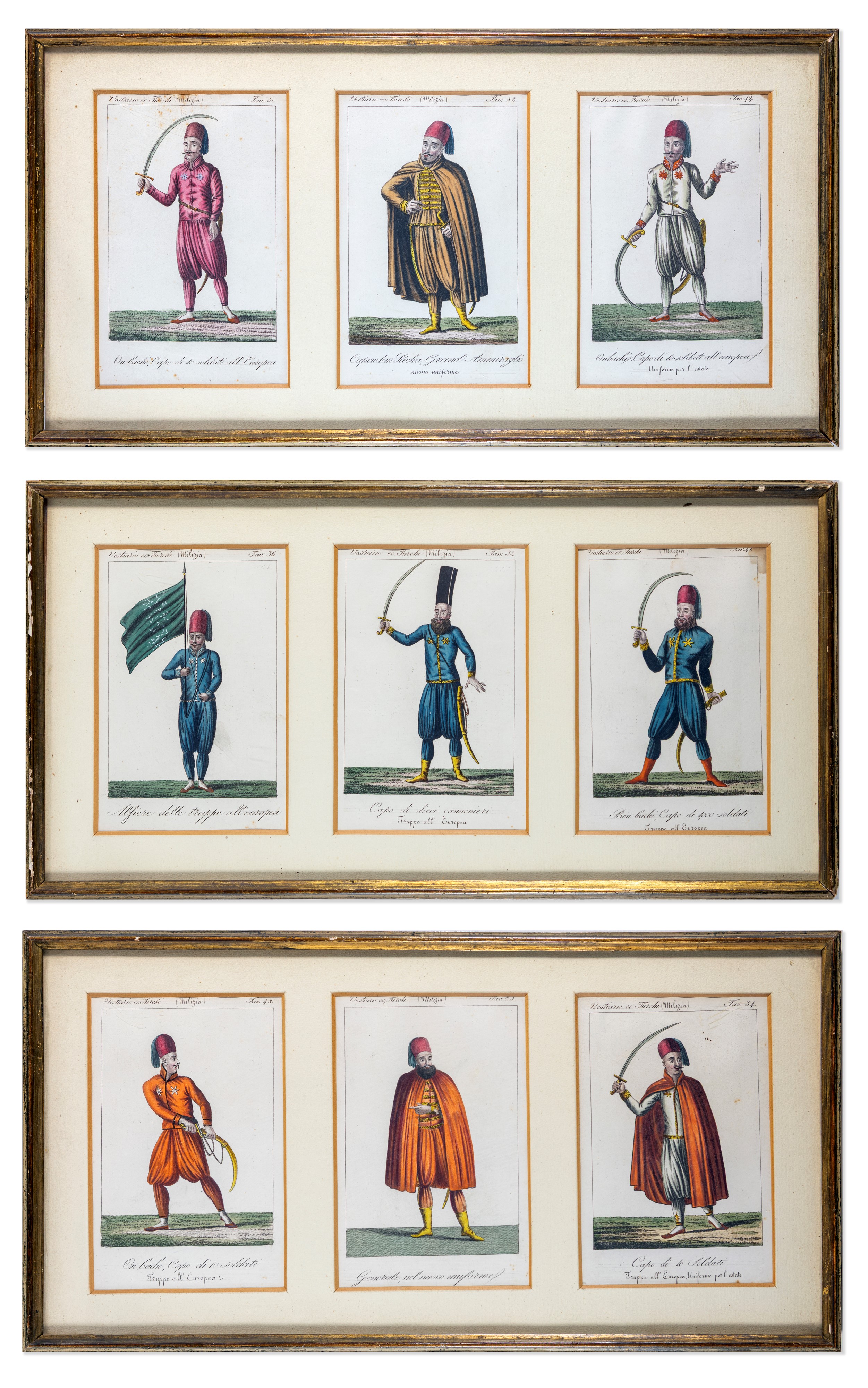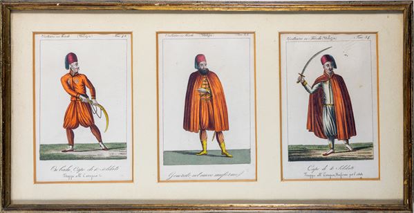 Nove incisioni colorate raffiguranti costumi musulmani, entro tre cornici, XIX secolo