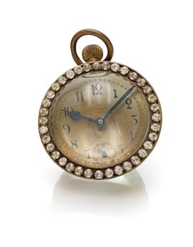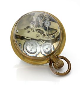 quadrante in ottone con fascia oraria a numeri arabi con mostrino sottostante per la sveglia; meccanismo a vista. Difetti
