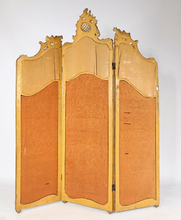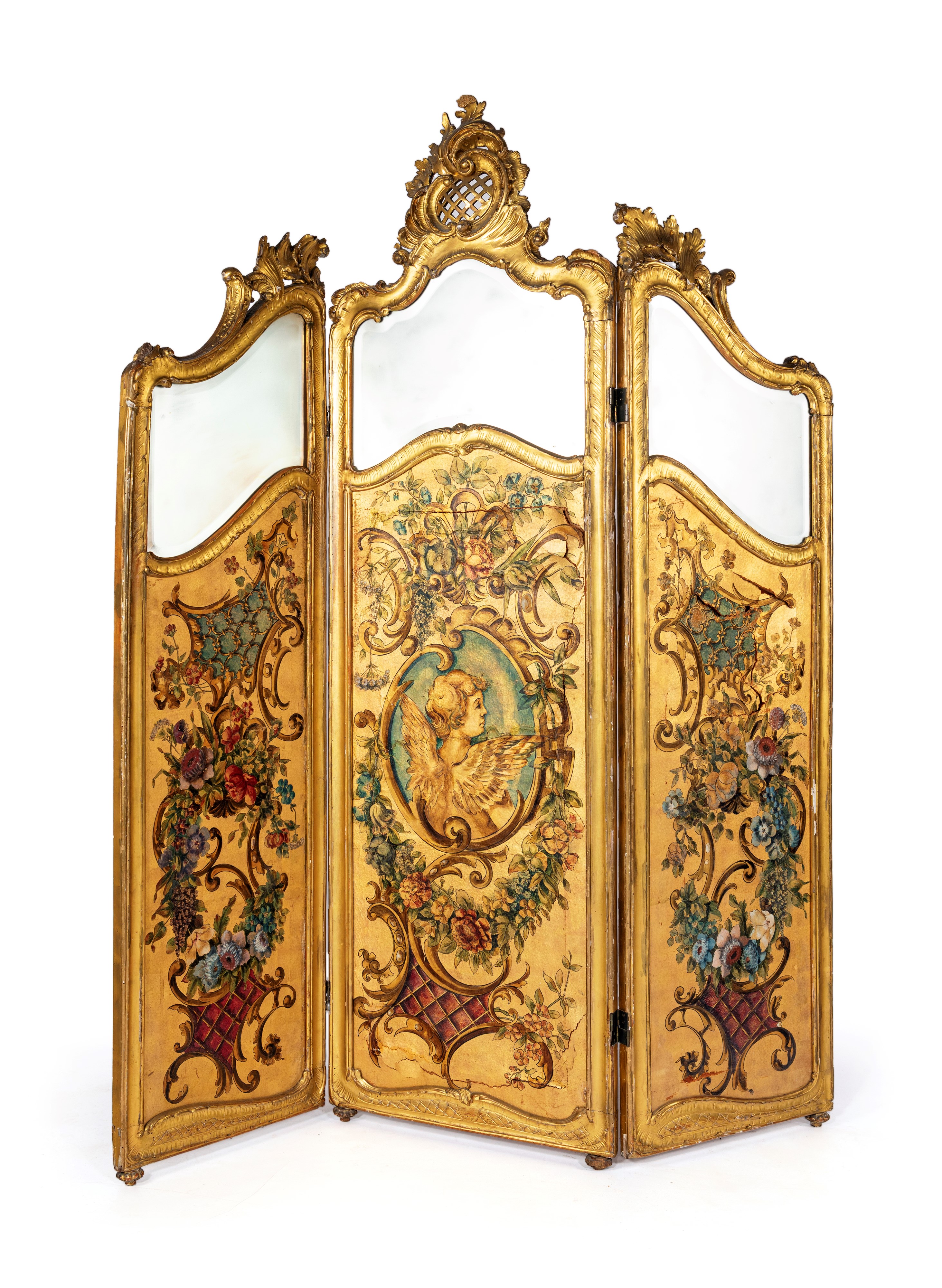 Paravento in legno dorato a tre ante con specchi e cuoio dipinto, fine XIX secolo