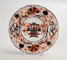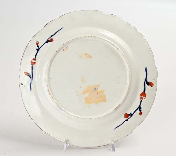 Piatto in porcellana, Inghilterra, XX secolo decorato a chnoiserie nei toni dell'Imari