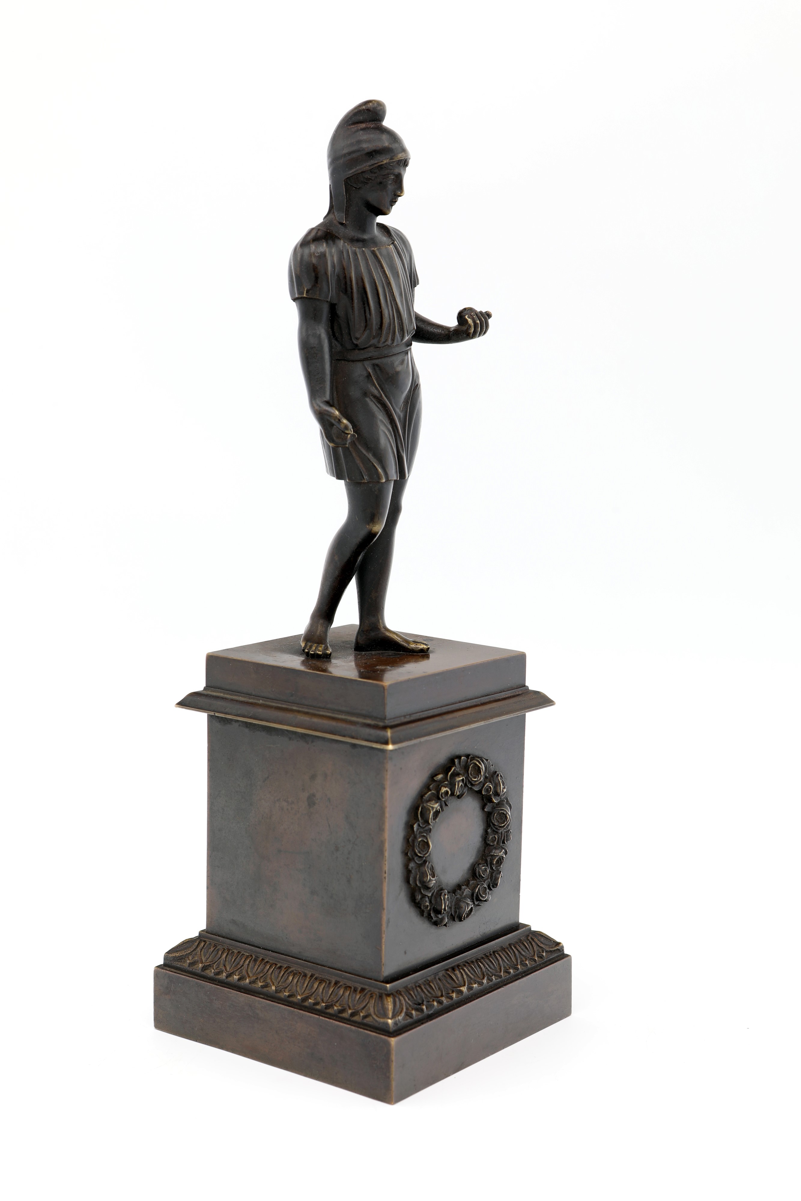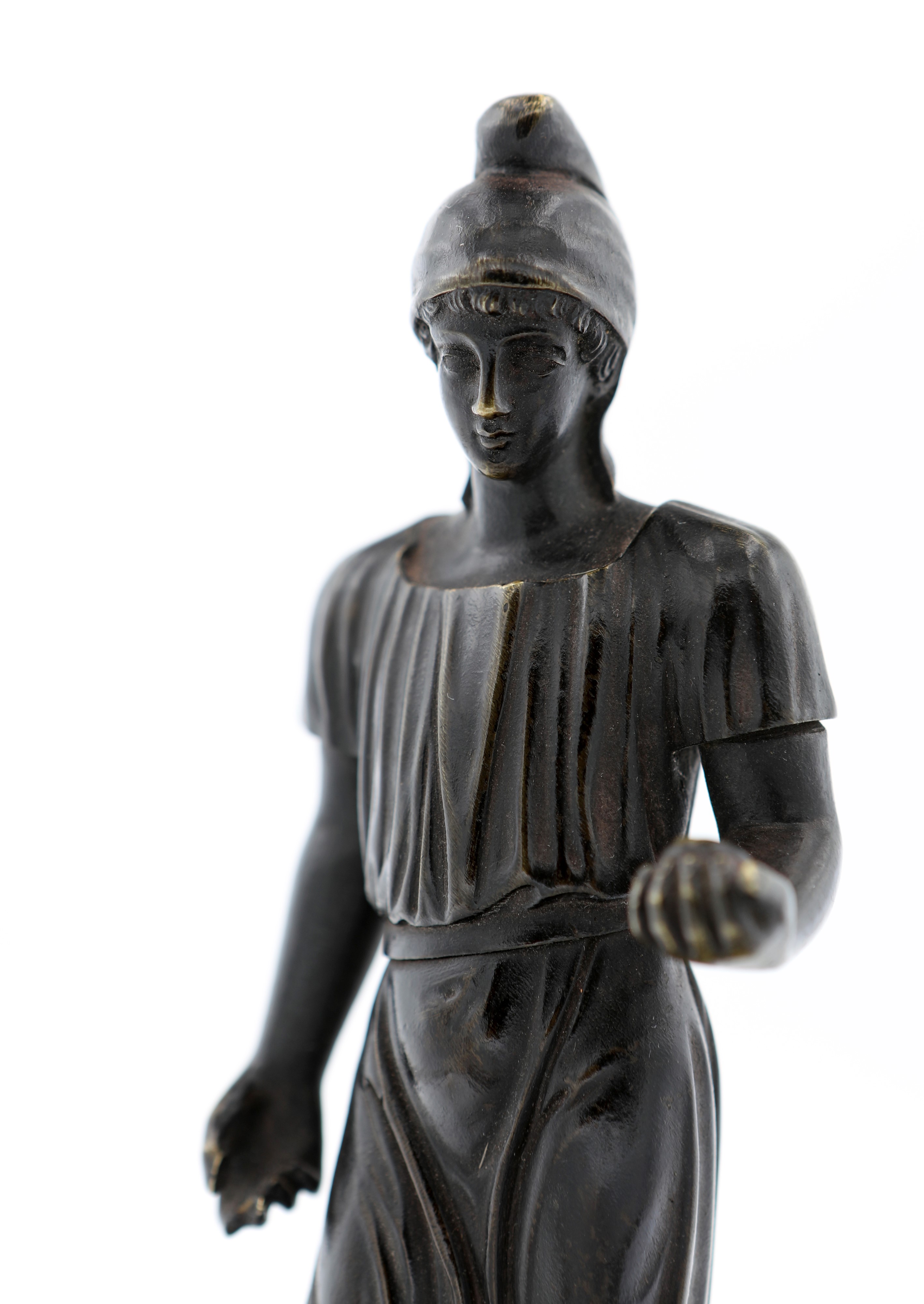 Piccola scultura in bronzo brunito raffigurante un oplita