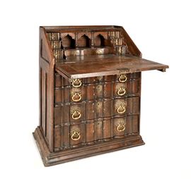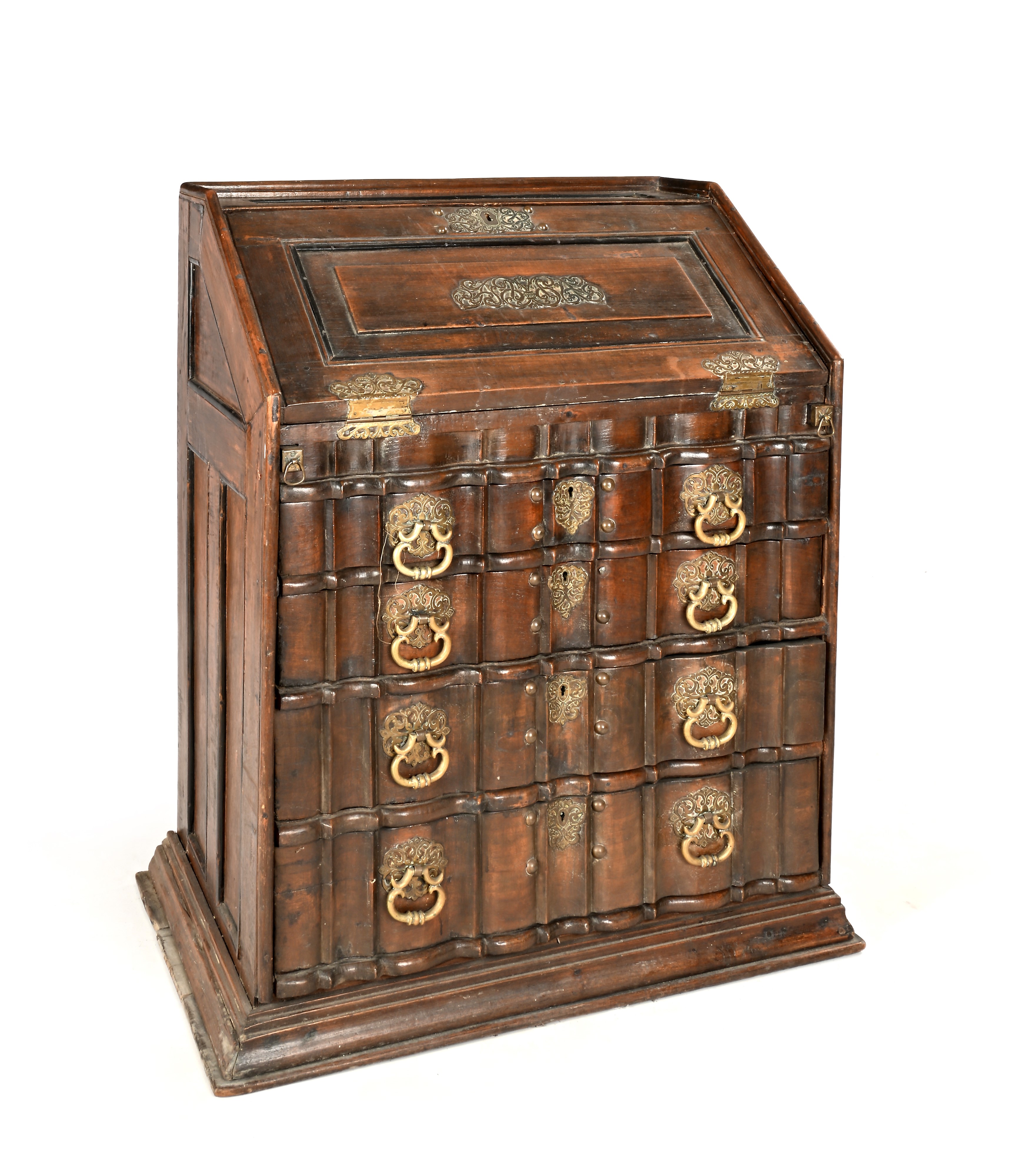 di linea squadrata su base a cornice modanata, reca quattro cassetti frontali di linea ondulata con bocchette e maniglie in bronzo; la ribalta ospita tre scompari centrali con profilo superiore centinato ad arco gotico, delimitati da lesene tortili con due tiretti in linea sottostanti privi di traversa; ai lati tre cassettini in colonna disposti a scalare con facciata mistilinea