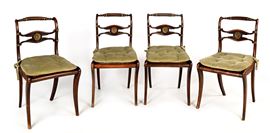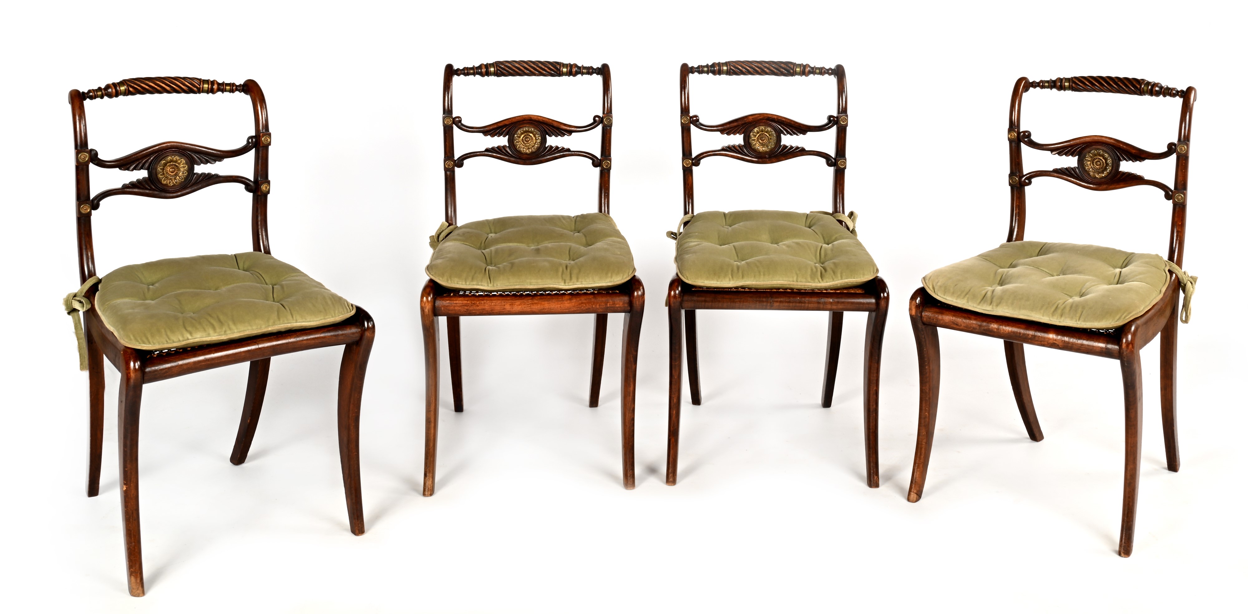 Quattro sedie Regency con finiture ornamentali in tolla dorata, Inghilterra, inizi del XIX secolo