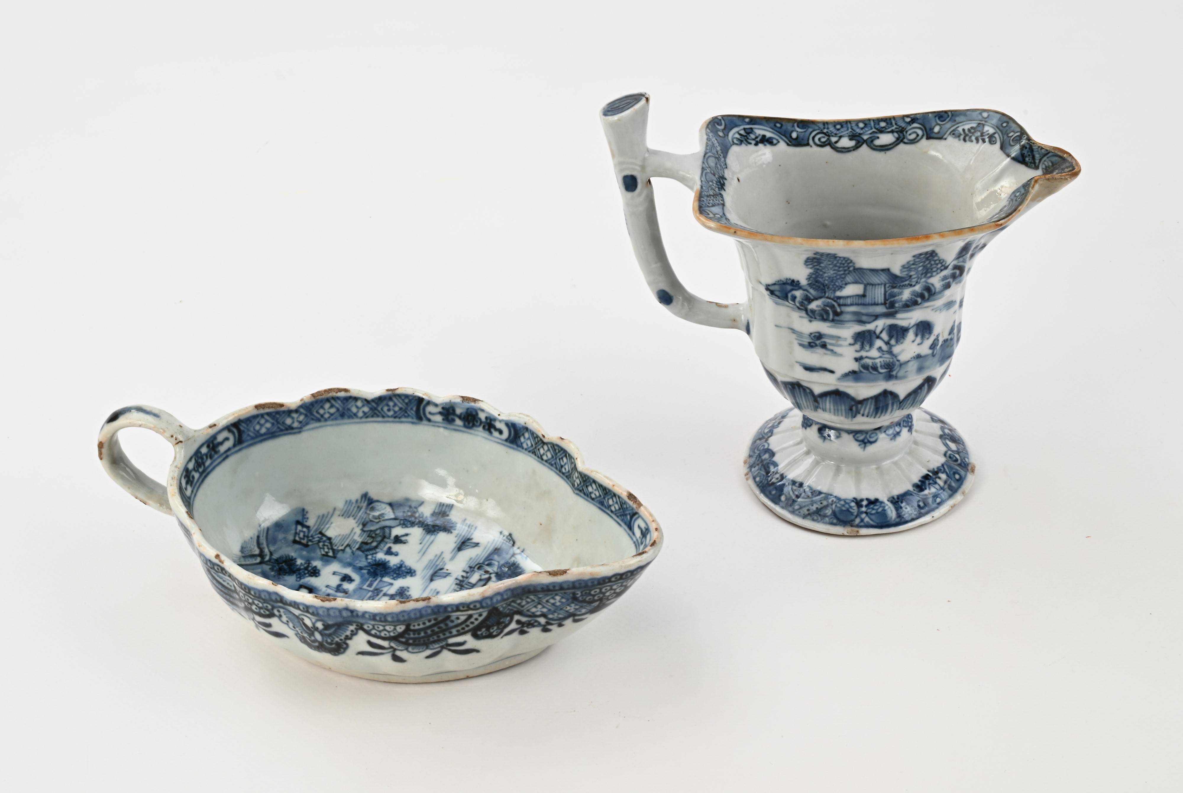 Salsiera a navicella e brocchetta in porcellana bianca e blu, Compagnia delle Indie, XVIII secolo