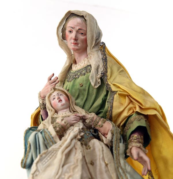 la prima abbigliata con lunga tunica viola sormontata da sopraveste verde con ricami e gallonatura; un ampio mantello giallo cinge entrambe le figure. La Vergine, con veste rosa chiaro e mantello azzurro cielo, trattiene fra le mani un drappo. Entrambe le figure recano velo di merletto sulla testa