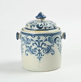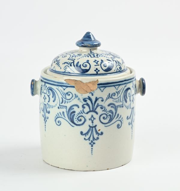brevi anse a rocchetto e coperchio sormontato da pomolo; decorazione minima a mascherina in blu lungo il profilo superiore. Rottura e mancanza