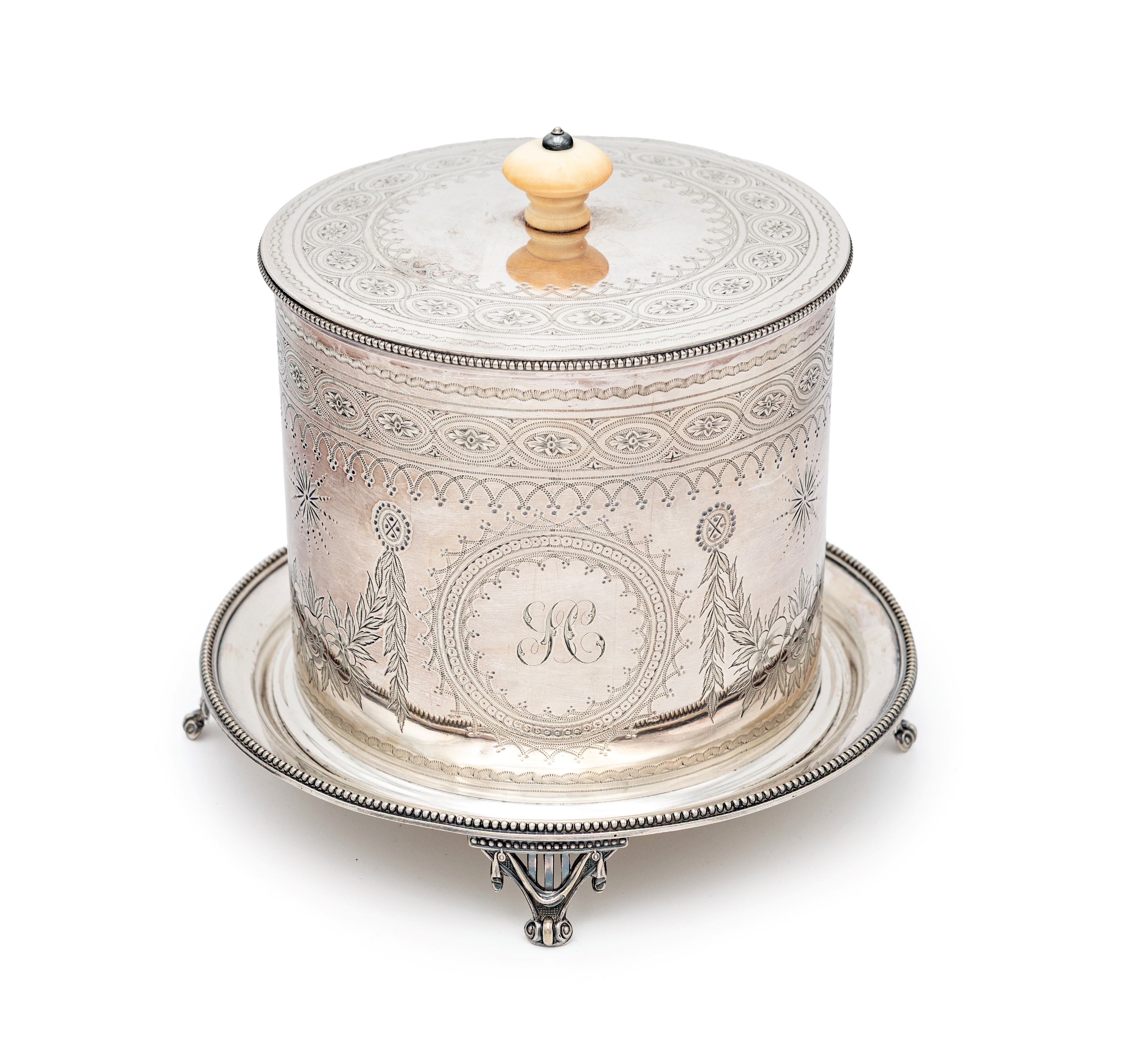 decorazione incisa, monogramma e profili perlinati; coperchio incernierato e piatto poggiante su piedi terminanti a ricciolo, rifiniti all'attaccatura da un panneggio