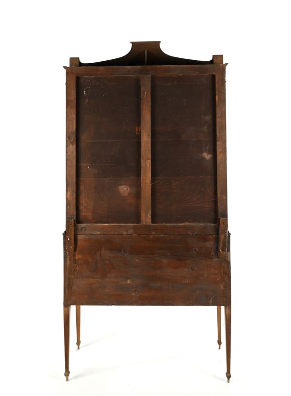 corpo superiore con ante a vetri e ripiani interni; corpo inferiore sorretto da sottili gambe rastremate, cinque vani portacarte e due cassetti all'interno del rullo