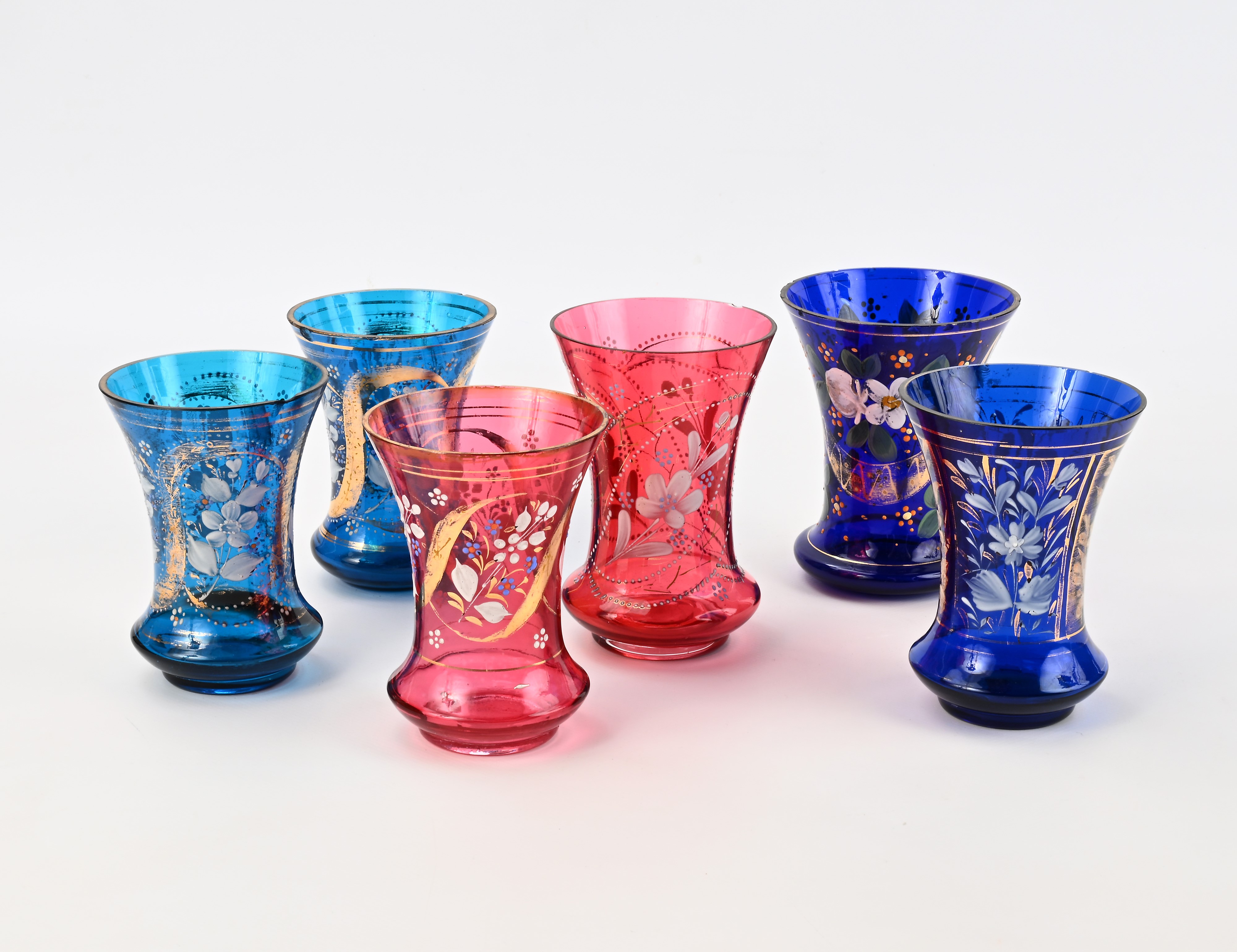 Sei bicchieri in vetro colorato e dipinto a motivi floreali, Boemia, XX secolo