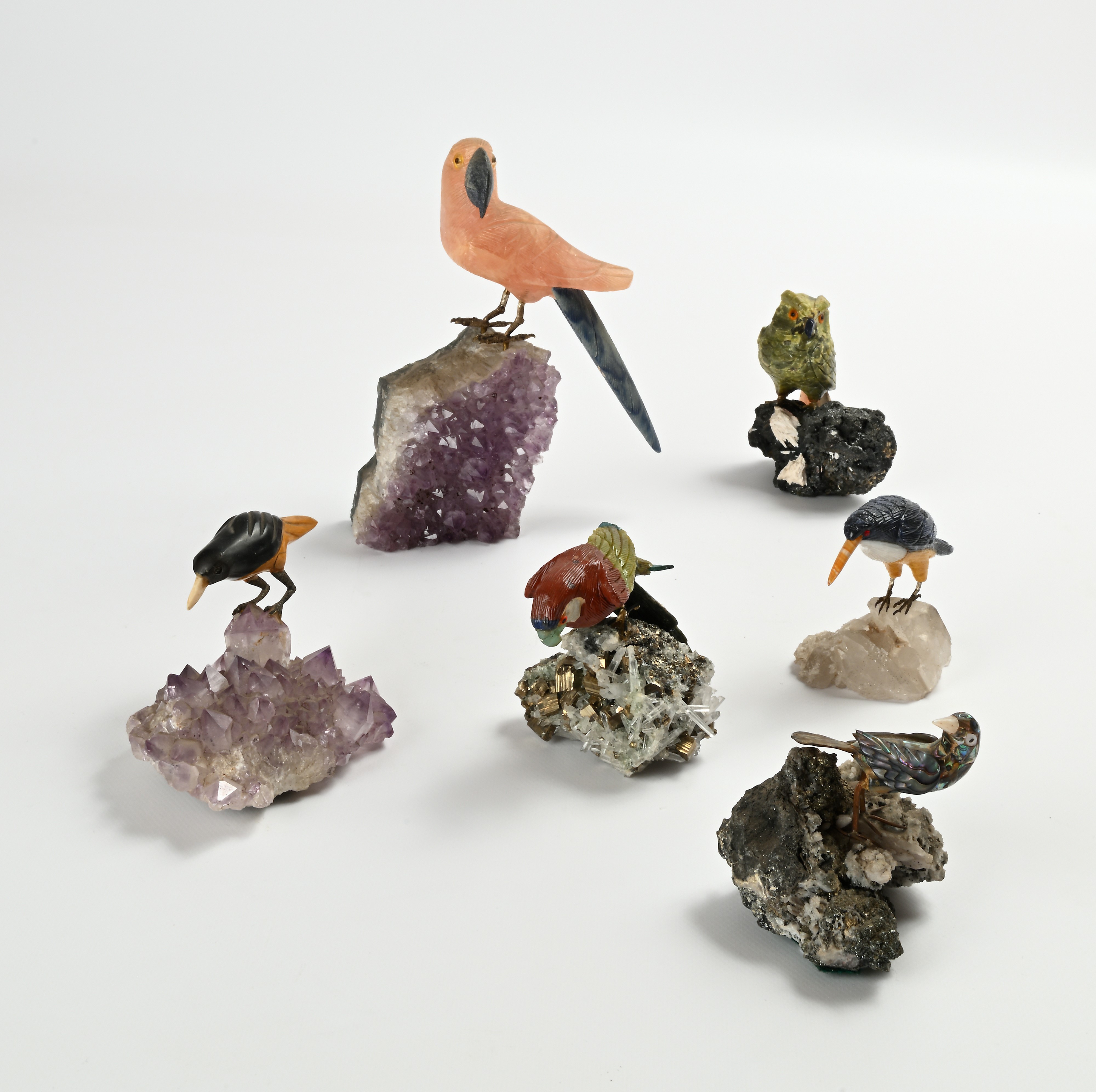 Sei figure di volatile diverse su basi in geodi di quarzo