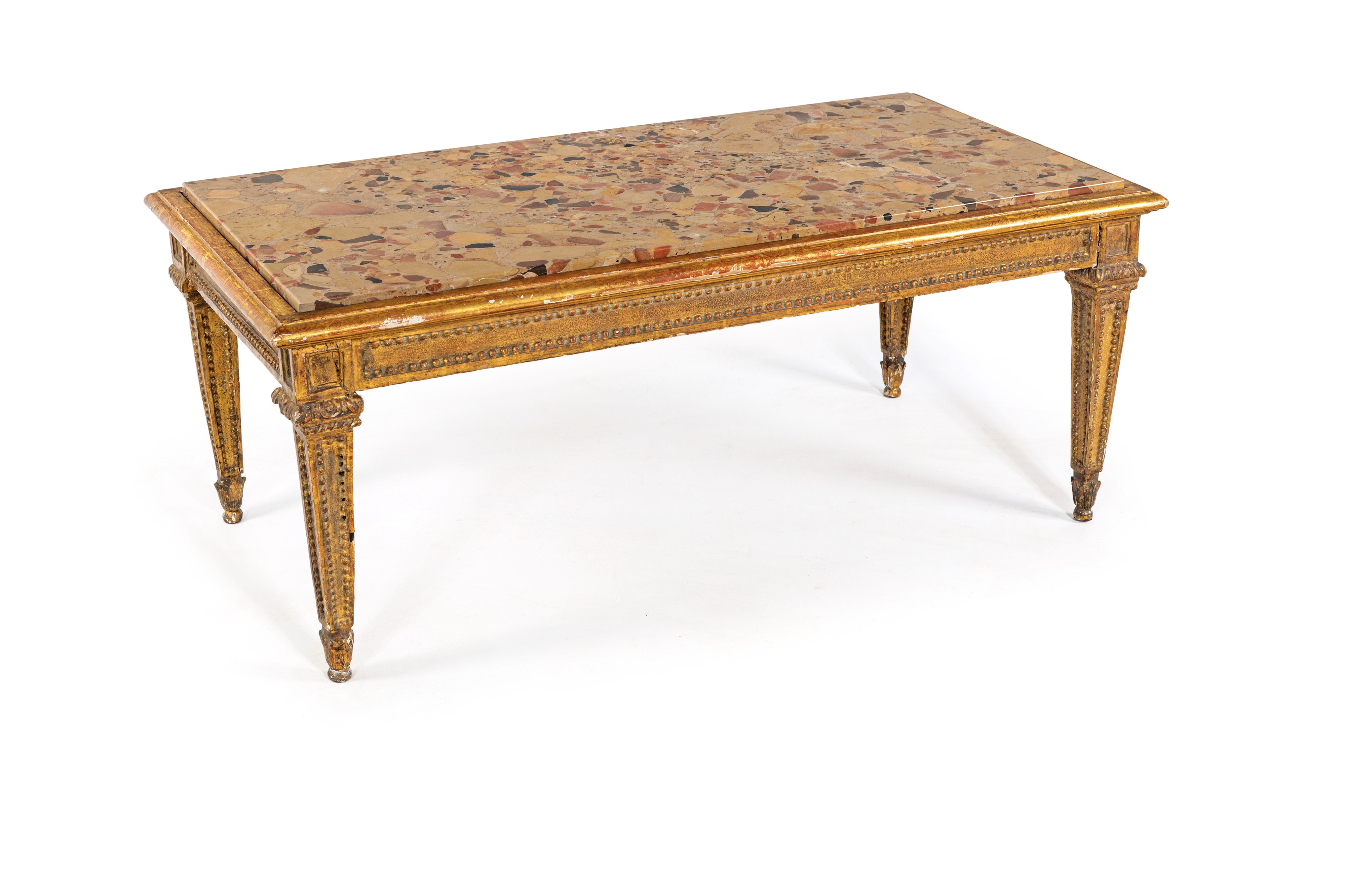 Tavolino basso in legno dorato con piano incassato in breccia d'Aleppo