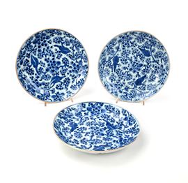 Tre piatti in porcellana bianca e blu con fitta decorazione floreale, Cina, XVIII secolo