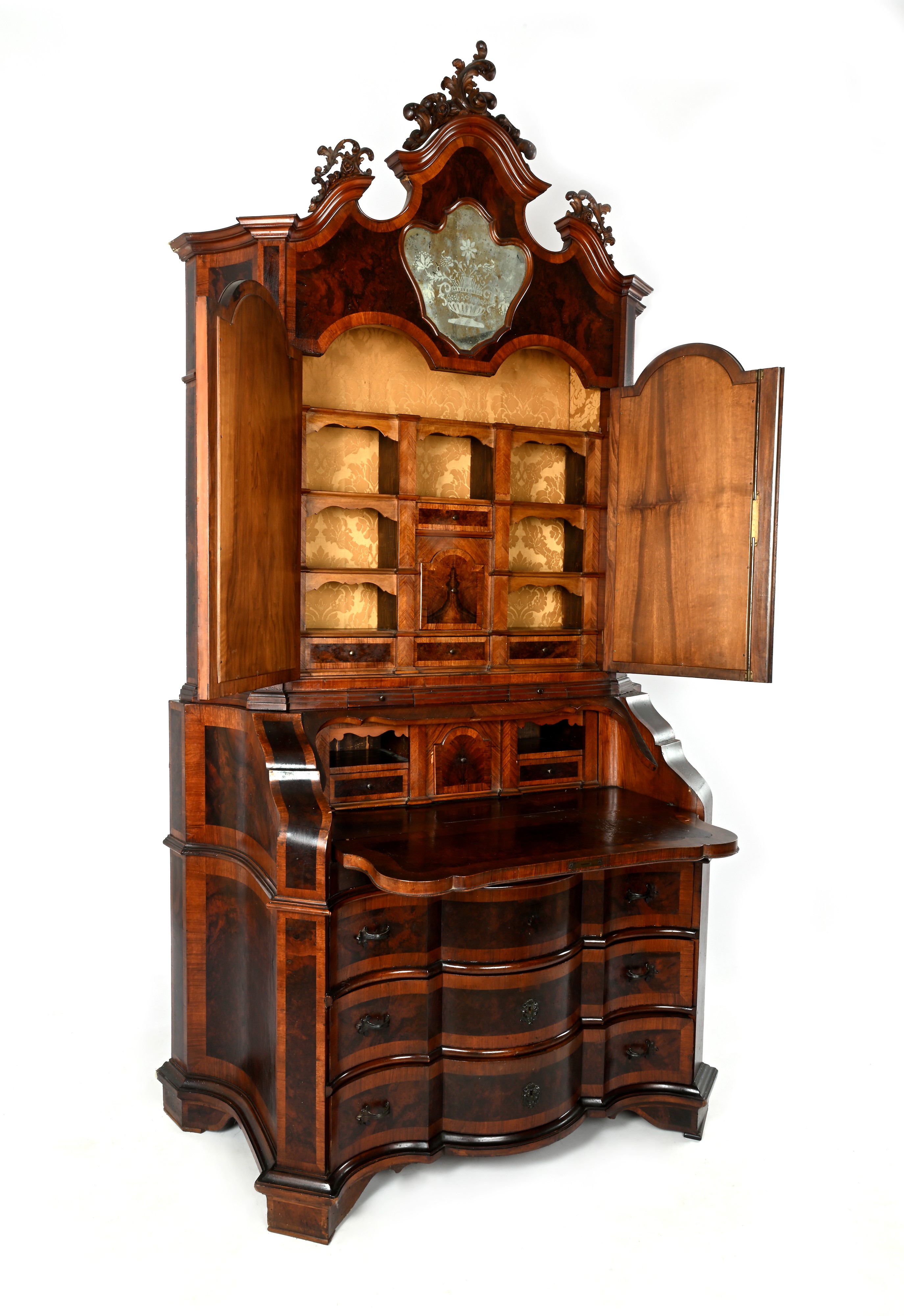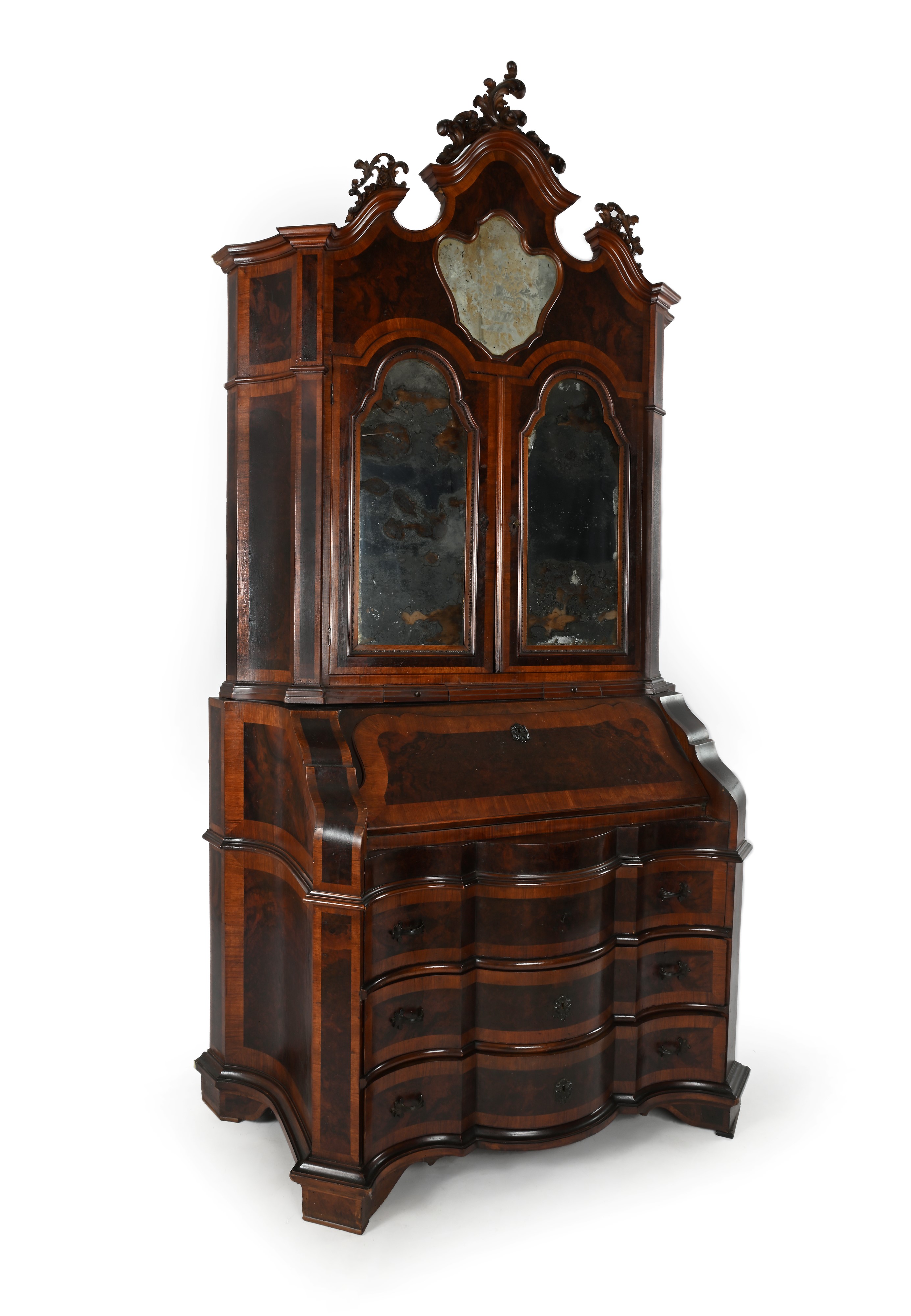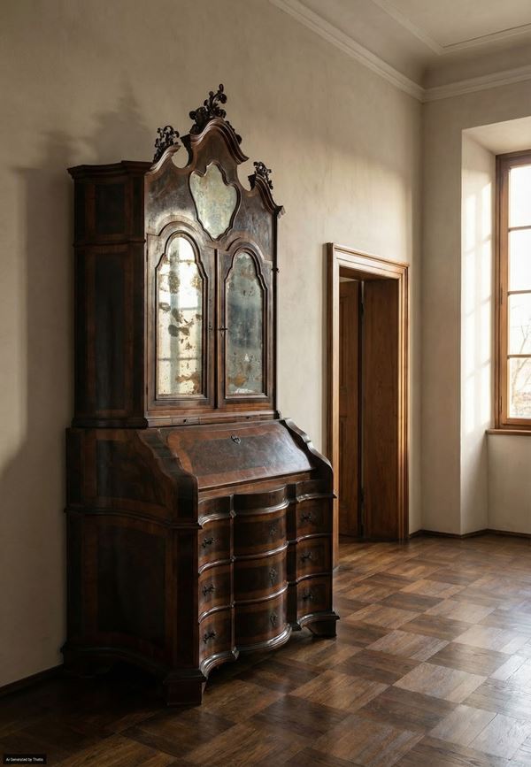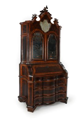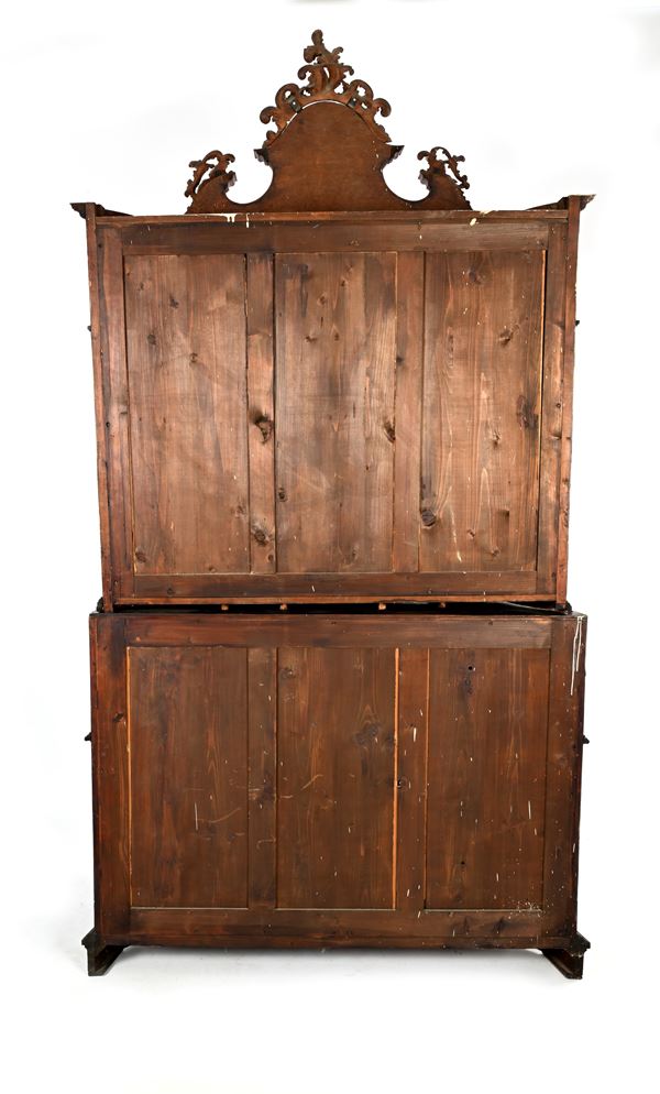 corpo superiore con cimasa centinata a specchio sormontata da un fregio intagliato a motivi vegetali e due ante con tablettes estraibili; corpo inferiore di linea trapezoidale con facciata sagomata suddivisa in tre cassetti e ribalta con all'interno ripiano con porzione mediana scorrevole e antina centrale centinata affiancata da un vano con tiretto sottostante simmetricamente disposti ai lati, delimitati da lesene estraibili a celare scomparti segreti; piedi a mensola. Difetti