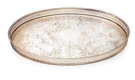 Vassoio ovale in sheffield con ringhiera e fitta decorazione incisa