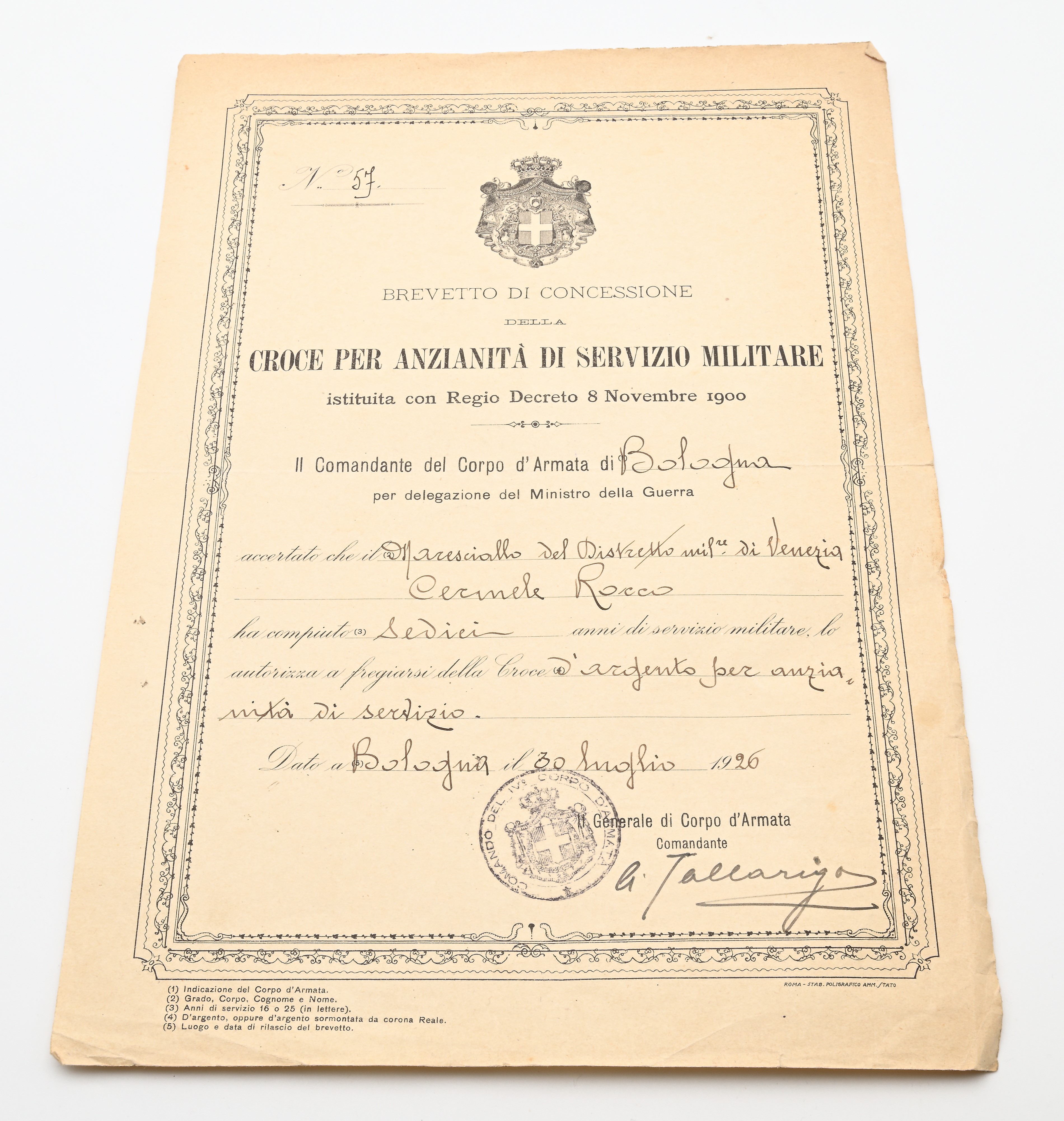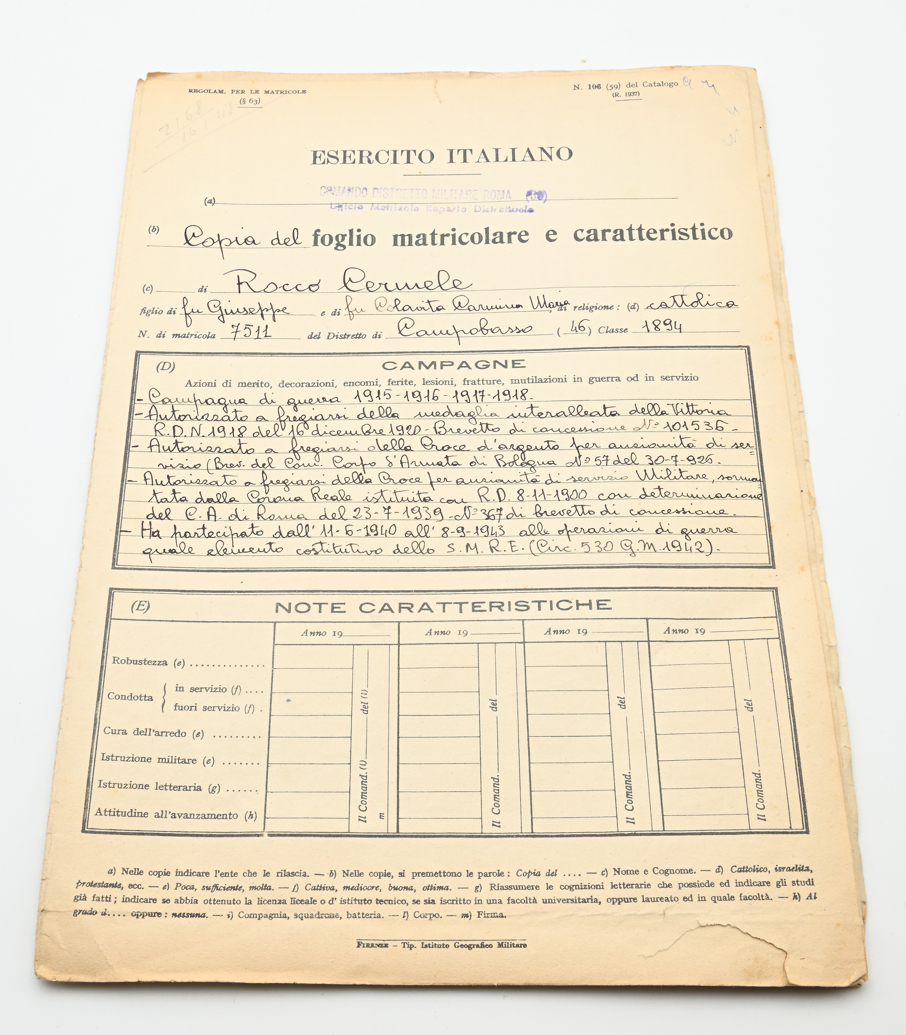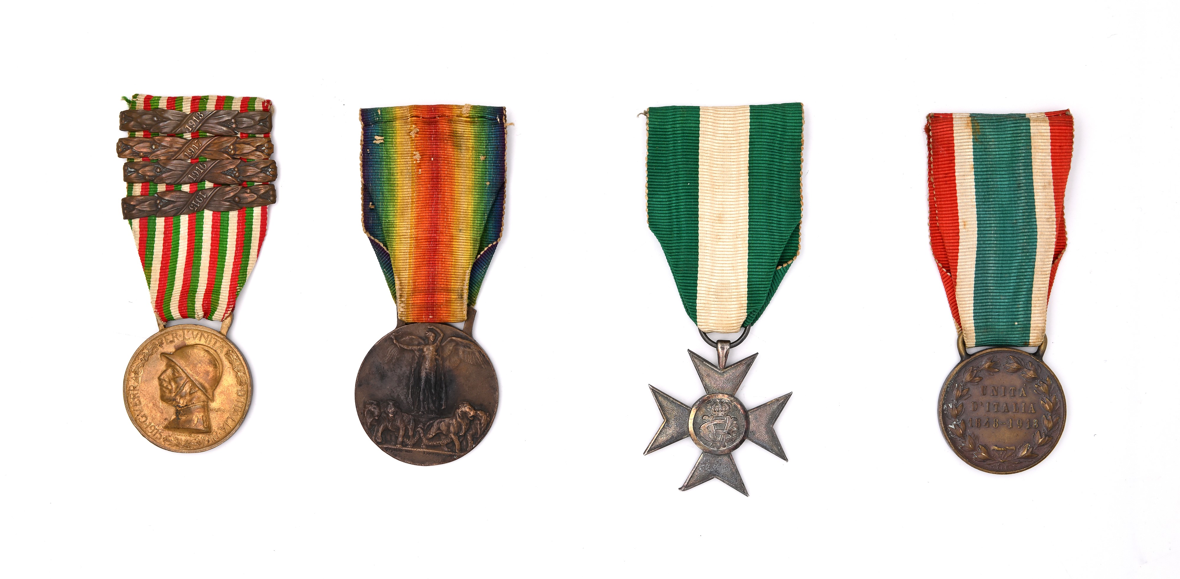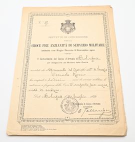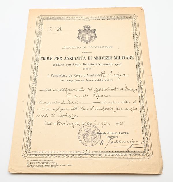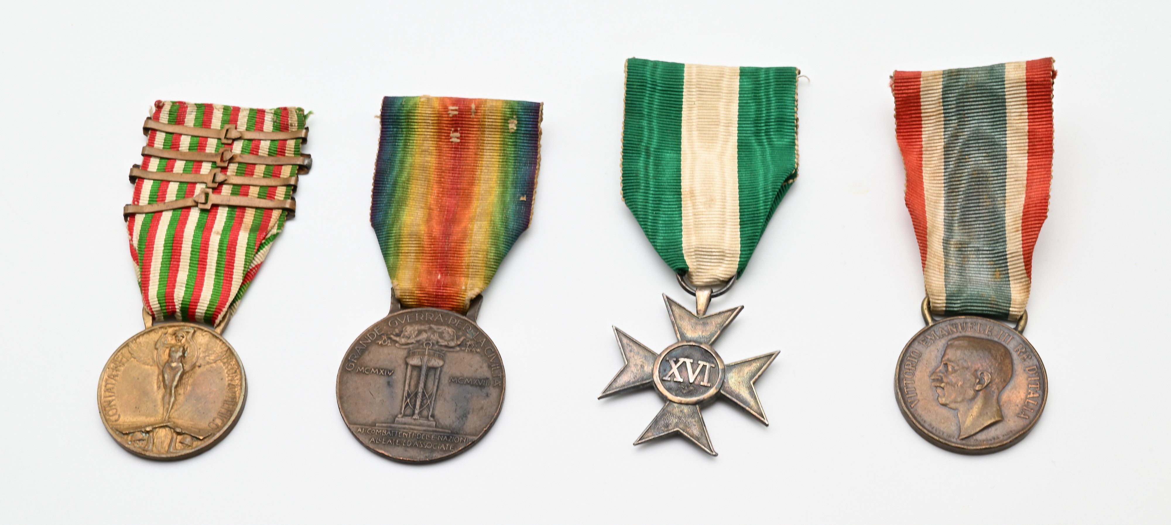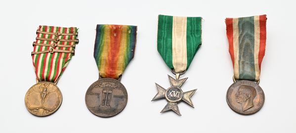 3 medaglie in bronzo della Prima Guerra Mondiale con nastrini originali e Medaglia (Croce d'argento) per i XVI Anni di Servizio del Regno d'Italia Vittorio Emanuele III Completo di Brevetto di concessione e copia del foglio matricolare