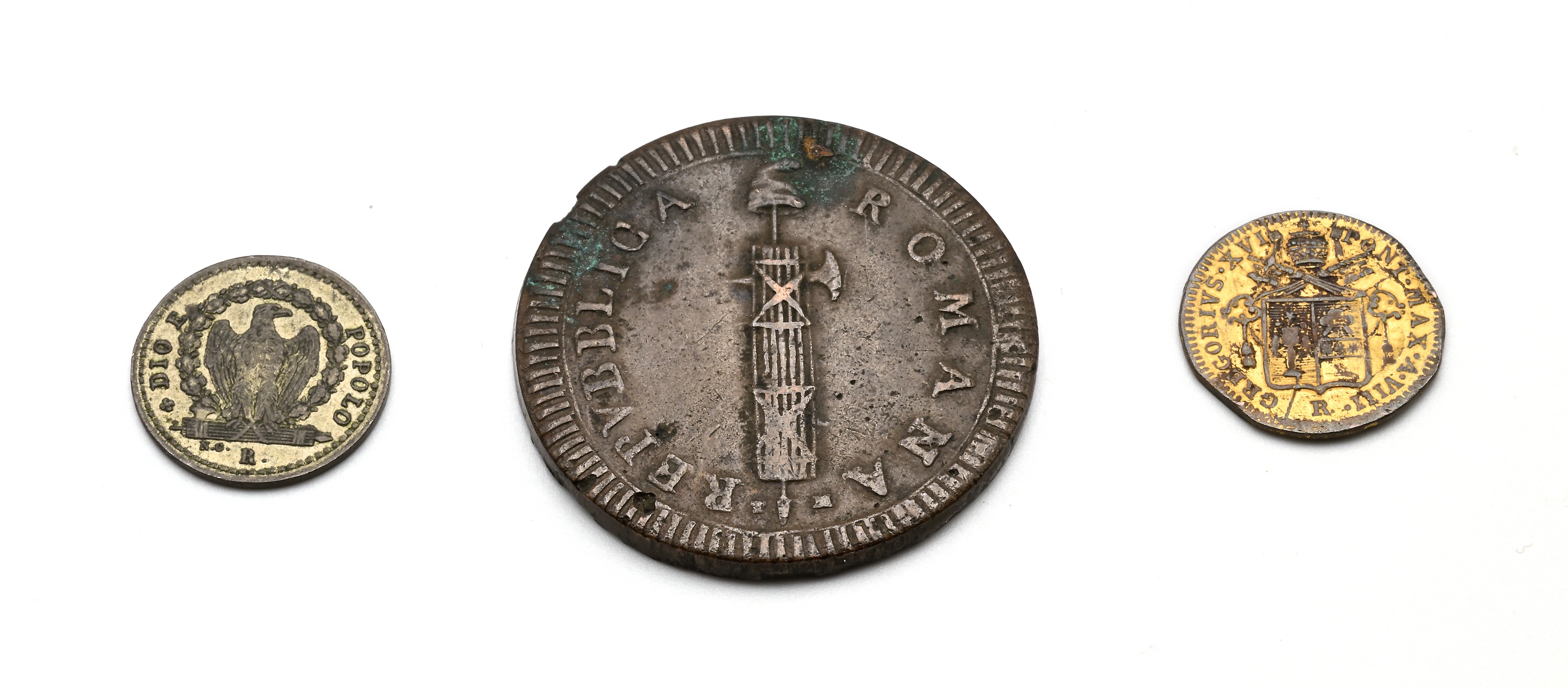 4 Baiocchi 1849R Seconda Repubblica Romana; Due Baiocchi senza data per Roma (37 mm) con iniziali T M Prima Repubblica Romana; Quattrino 1838R Gregorio XVI (in rame dorato)