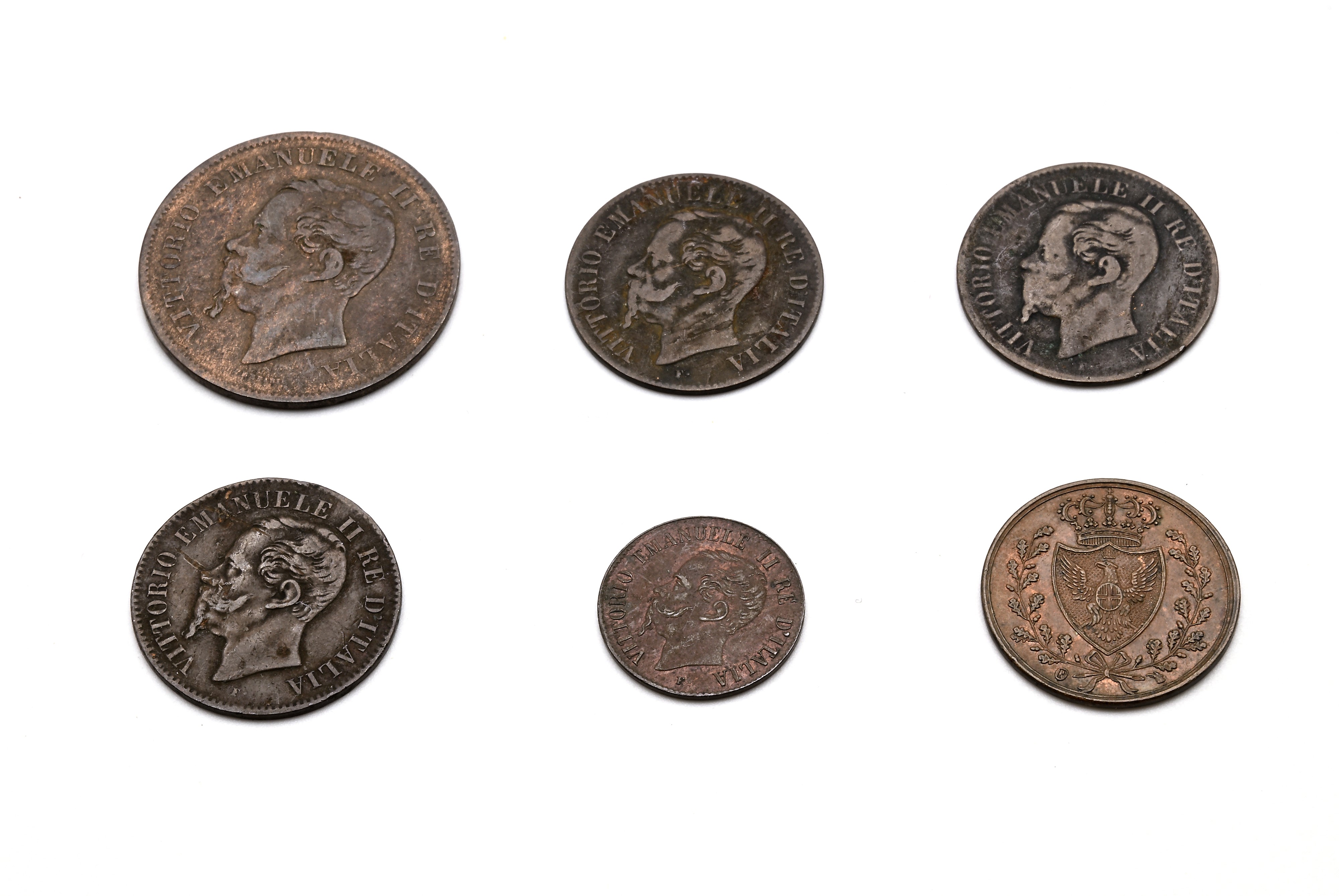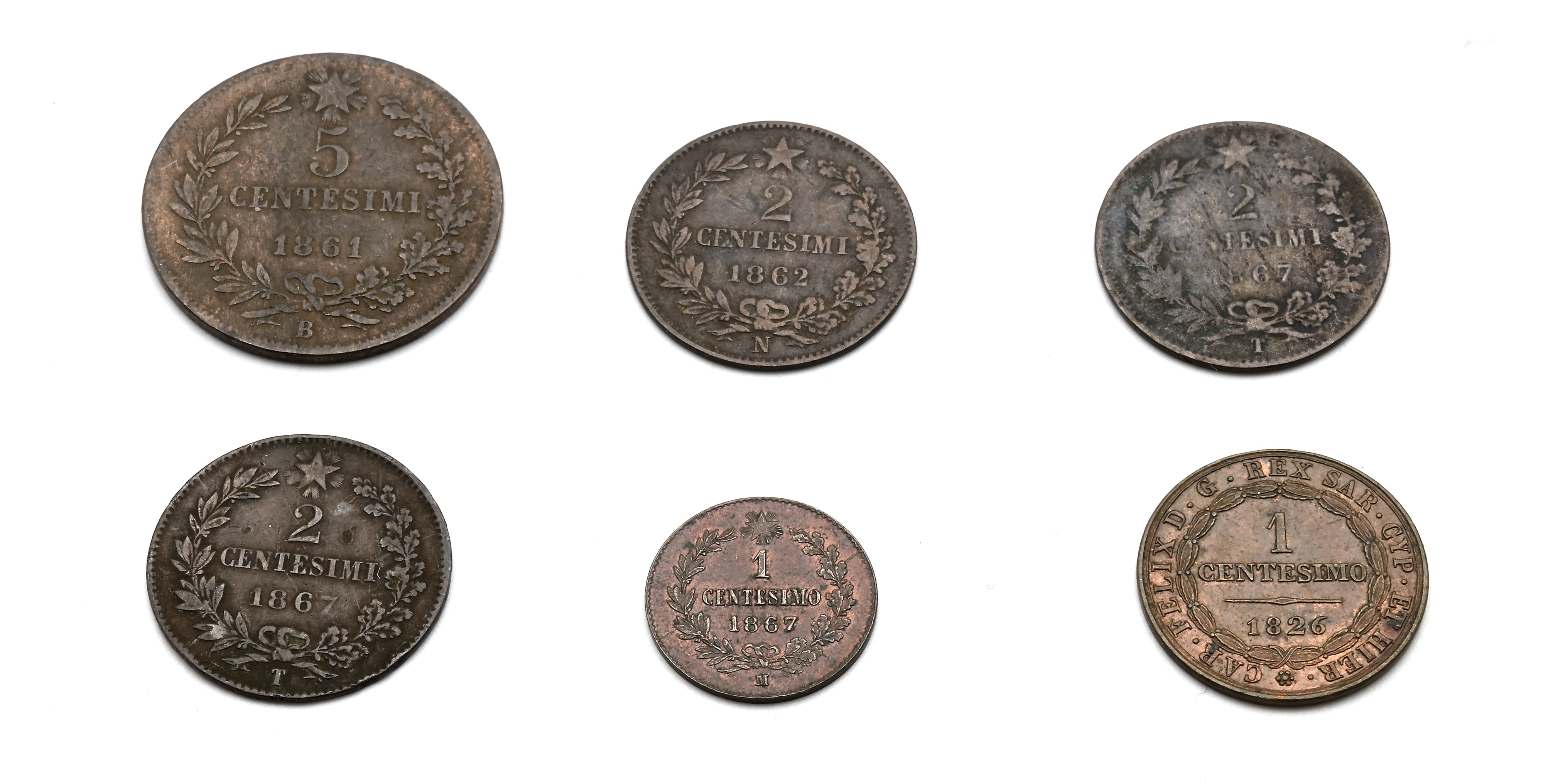 5 Centesimi 1861 Bologna; 2 Centesimi 1867T (2 pz.); 2 Centesimi 1862N; 1 Centesimo 1867M Vittorio Emanuele II Regno d'Italia; 1 Centesimo 1826 Genova Carlo Felice Regno di Sardegna