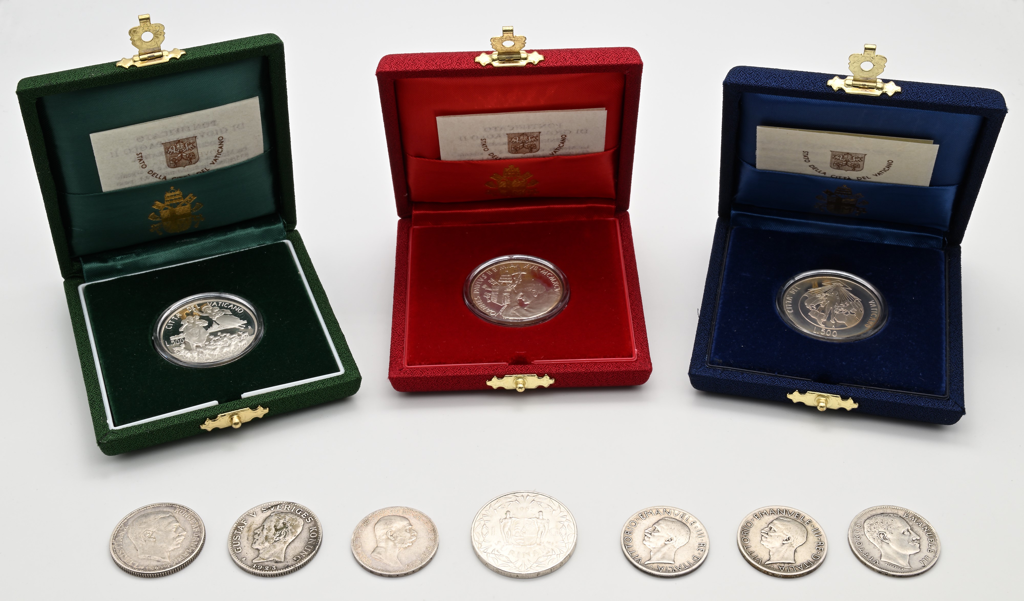 500 Lire Proof 1994, 1995, 1996 Città del Vaticano Giovanni Paolo II; Lira 1902; 5 Lire 1927, 1930 Regno d'Italia Vittorio Emanuele III; Corona 1908 Francesco Giuseppe Austria; Krone 1916 Danimarca; Krone 1923 Svezia; Gulden Suriname 1962