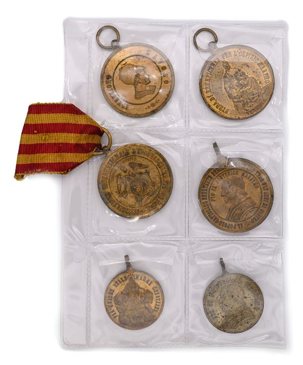 6 medaglie in bronzo dorato del XIX secolo: Fiera dell'Ospizio Marino di Venezia 1869; XXV° Anniversario di Pontificato di Pio IX 1871 (2 pezzi), Al Merito dell'Associazione Internazionale D'Incoraggiamento Napoli, Circolo Torinese Istruzione e Lavoro; Pia Unione della Madri Cristiane