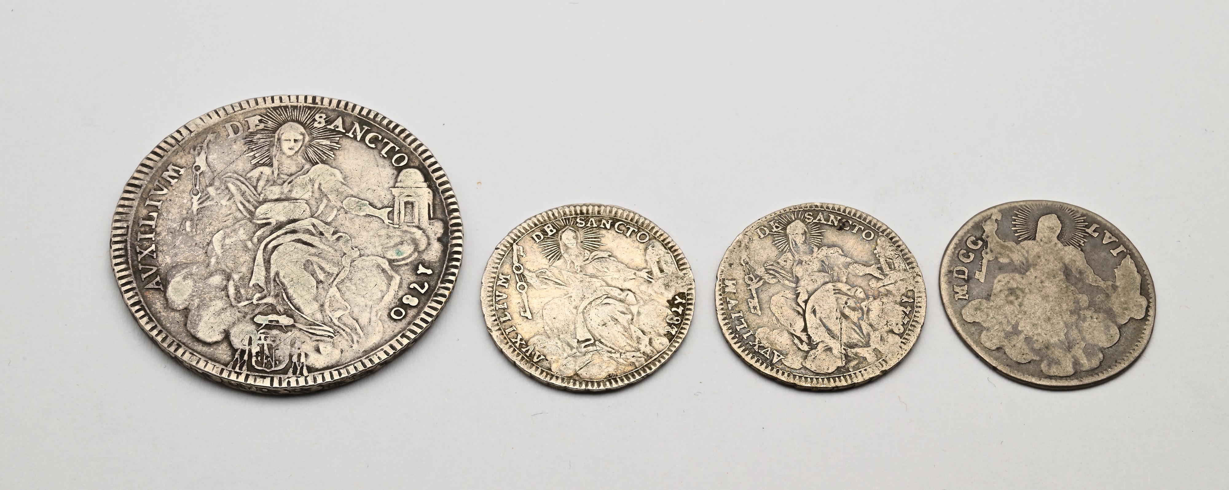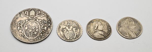 Doppio Giulio 1756 A.XVII Benedetto XIV; Doppio Giulio 1779 A.IV, Doppio Giulio 1787 A.XIII, Scudo 1780 A.VI Pio VI Stato Pontificio