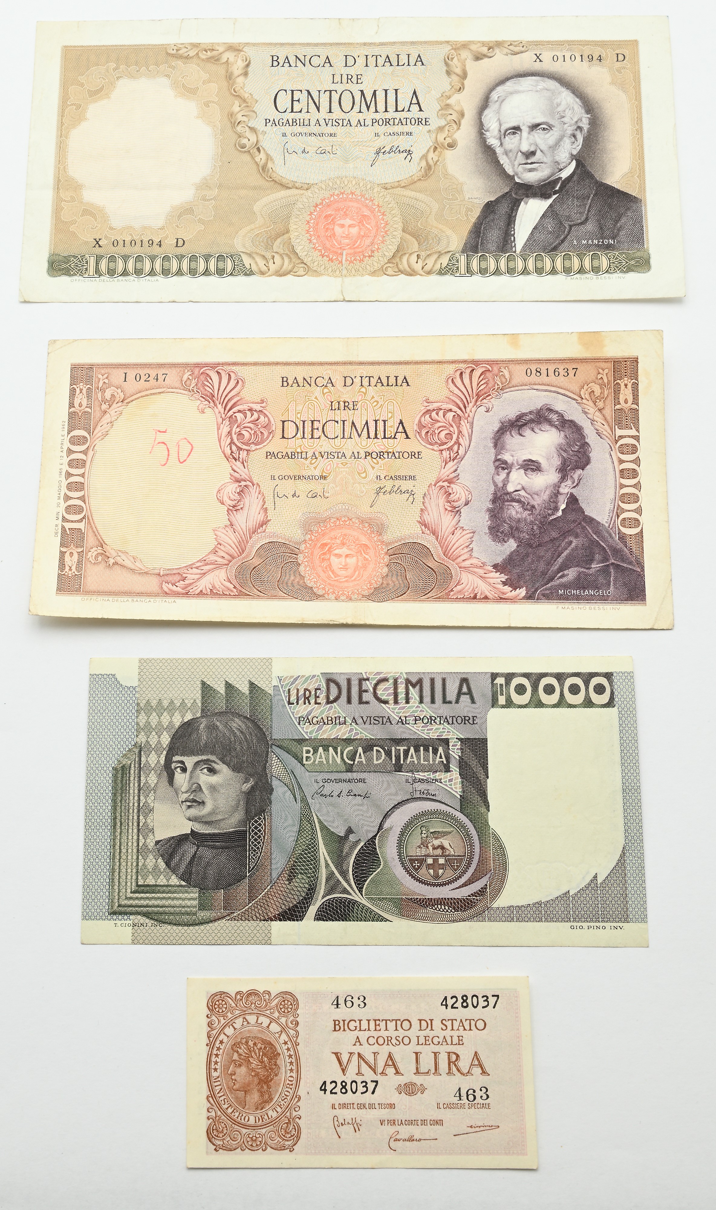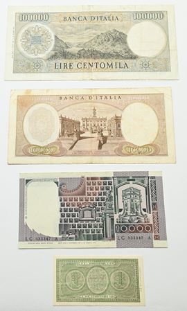 Lotto 4 banconote: Repubblica Italiana 100.000 Lire Manzoni Carli/Febbraio D.M. 3.07.1967 (X010194D); 10.000 Lire Michelangelo Carli/Febbraio D.M. 20.05.1966 (I0247-081637); 10.000 Lire Andrea del Castagno Ciampi/Stevani D.M. 3.11.1982 (LC533347A). E Luogotenenza: 1 Lira Biglietto di Stato Bolaffi/Cavallaro D.M. 23.11.1944