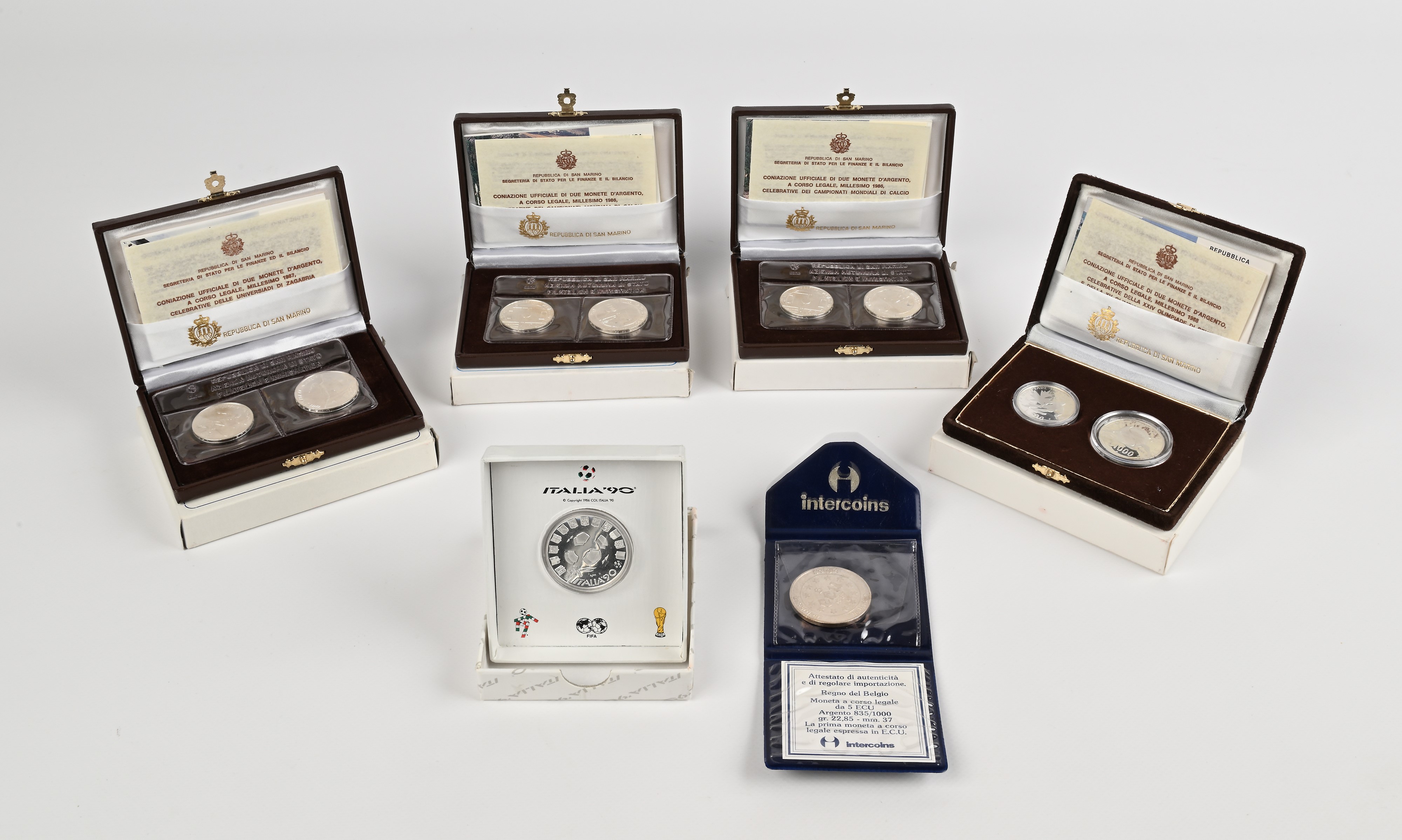Lotto 4 dittici 500 e 1.000 Lire 1986 FDC (2), 1987 FDC, 1988 Proof San Marino; Medaglia Italia '90; 5 ECU 1987 Belgio