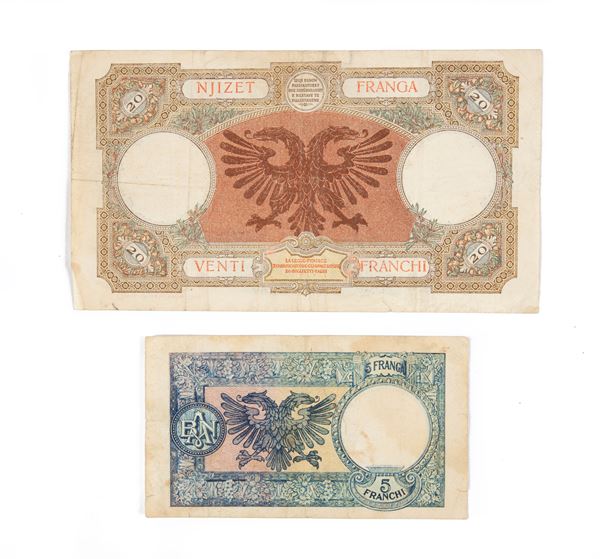 Lotto Cartamoneta Albania: 20 Franchi 1939 Banca Nazionale d'Albania Serie T21 0689; 5 Franchi 1939 Banca Nazionale d'Albania Serie Q39 6007