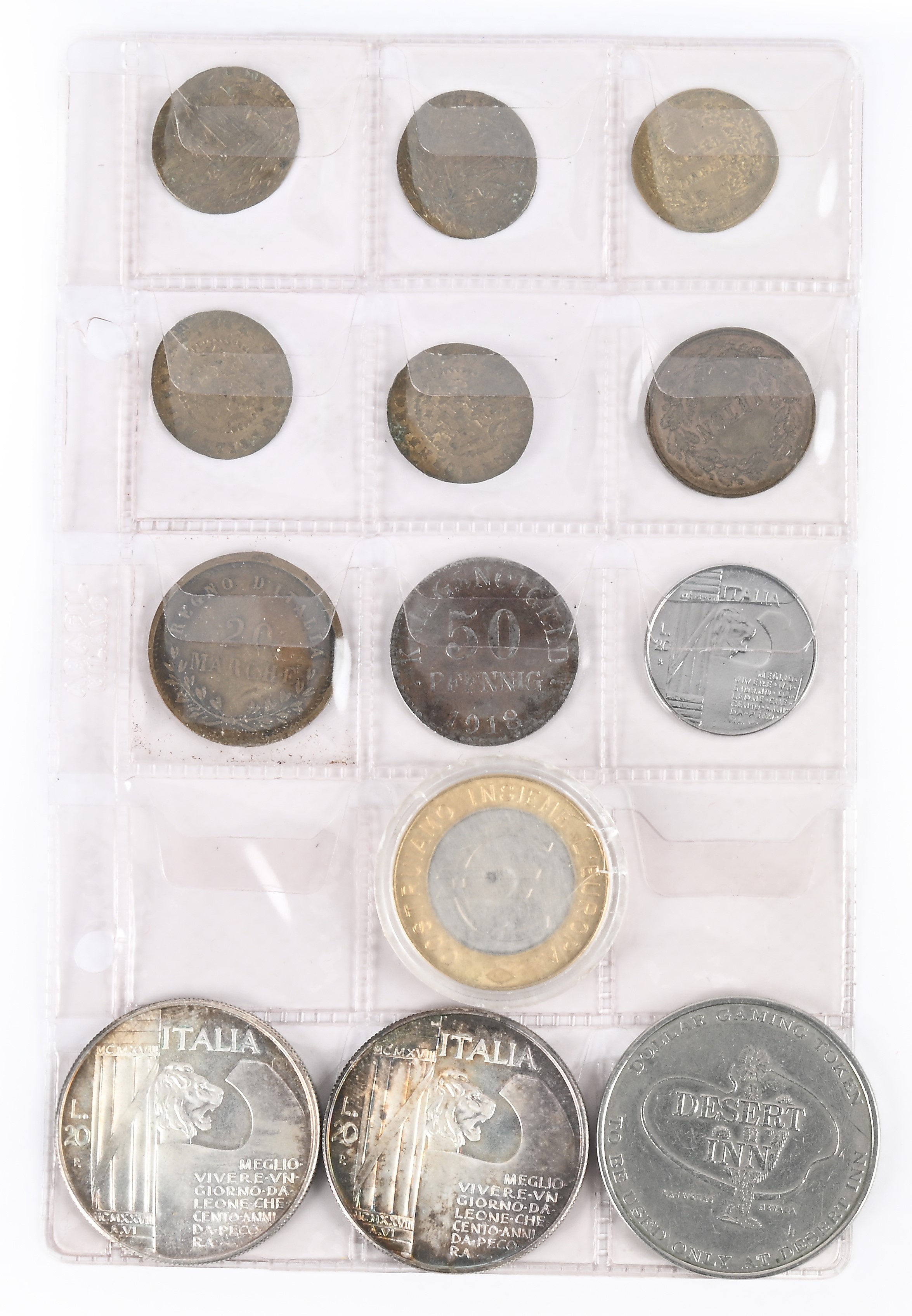 Lotto con: 4 gettoni mercantili di Norimberga; 2 Spiel Marke; gettone da 20 Marche 1892 Umberto I; 50 Pfennig 1918 Braunschweig Kriegsnotgeld; 1 dollaro token Desert Inn Las Vegas Usa, 1 Gettone Euro; e 3 monete di fantasia con Mussolini