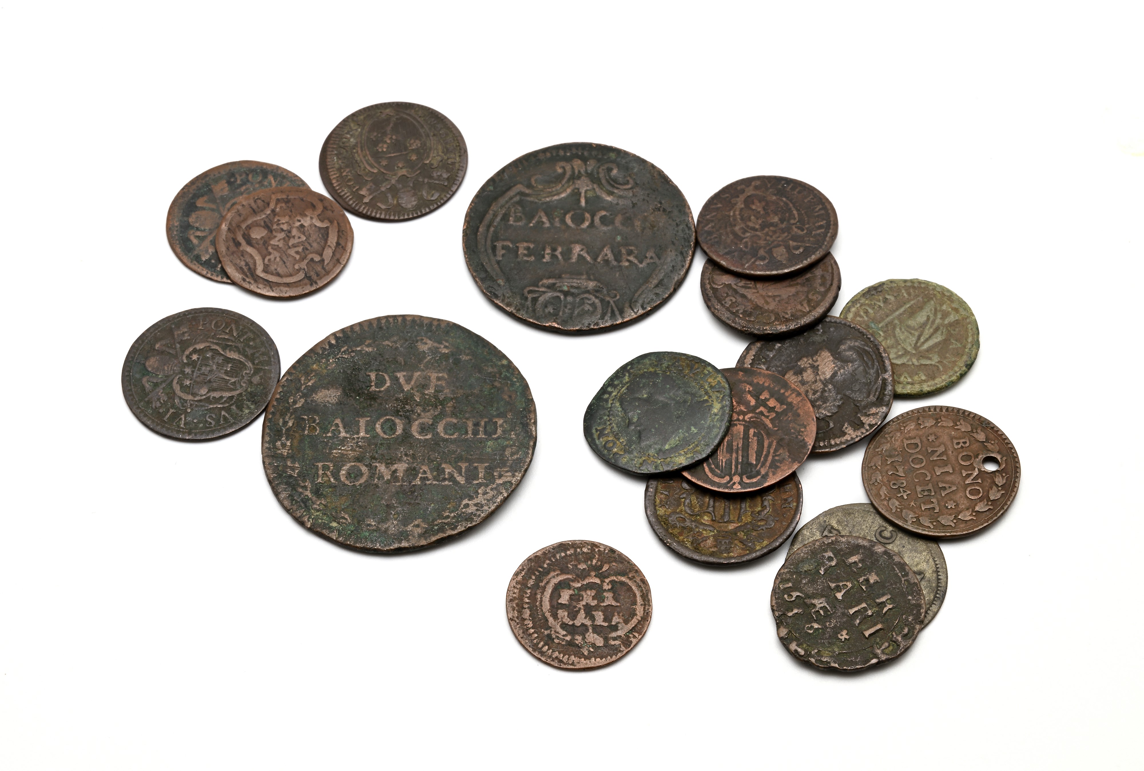 Lotto di 17 monete di rame dello Stato Pontificio (da Paolo V a Pio VI, per Ferrara, Ravenna, Bologna...)