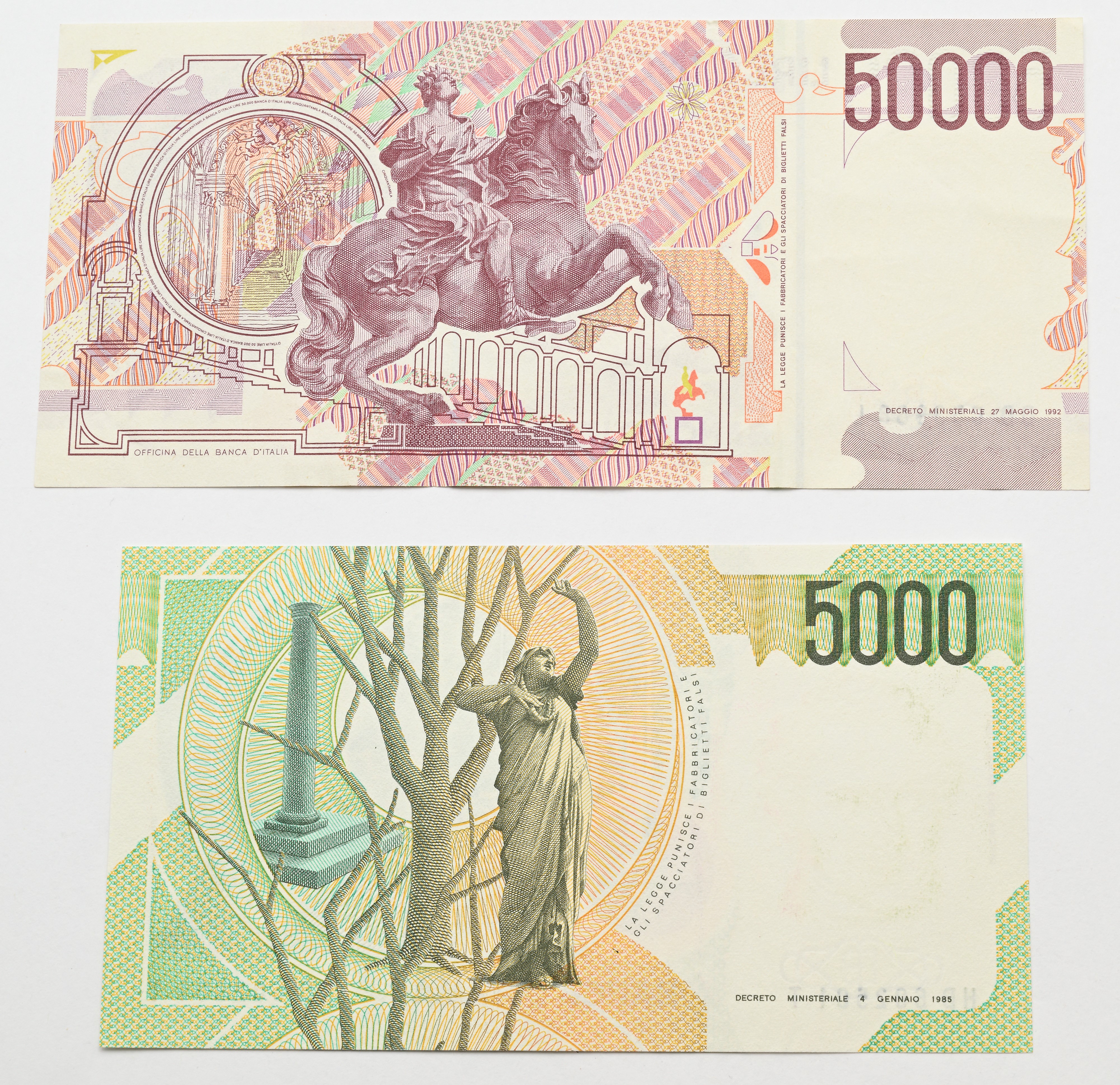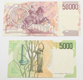 Lotto di 2 Banconote della Repubblica Italiana: 50.000 Lire Bernini II° Tipo Ciampi/Speziali D.M. 27.05.1992 (DD053988L); 5.000 Lire Bellini Fazio/Amici D.M. 4.01.1985 (HD602501T)