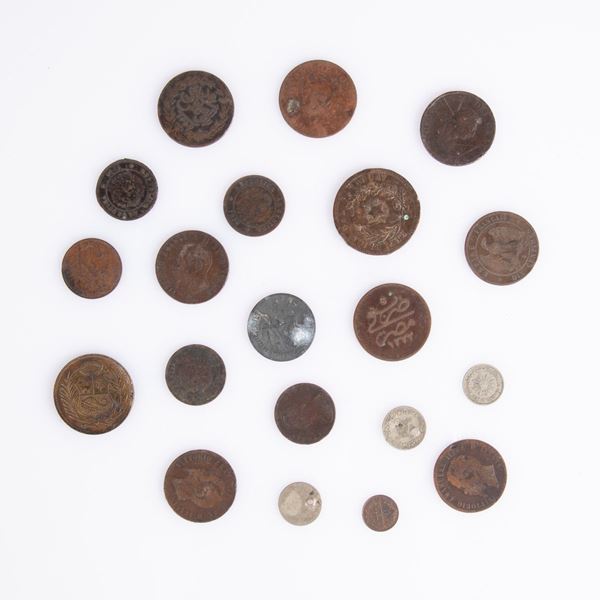 Lotto di 20 monete italiane e straniere XIX e XX secolo: 10 centesimi 1866 Strasburgo e Napoli Vittorio Emanuele II; 1 Centesimo 1900 Umberto I; 5 Centesimi 1918 Vittorio Emanuele III Regno d'Italia; 4 Centesimi 1870 (variante) Paraguay; Francia, Gran Bretagna, Impero Ottomano, Argentina e Uruguay