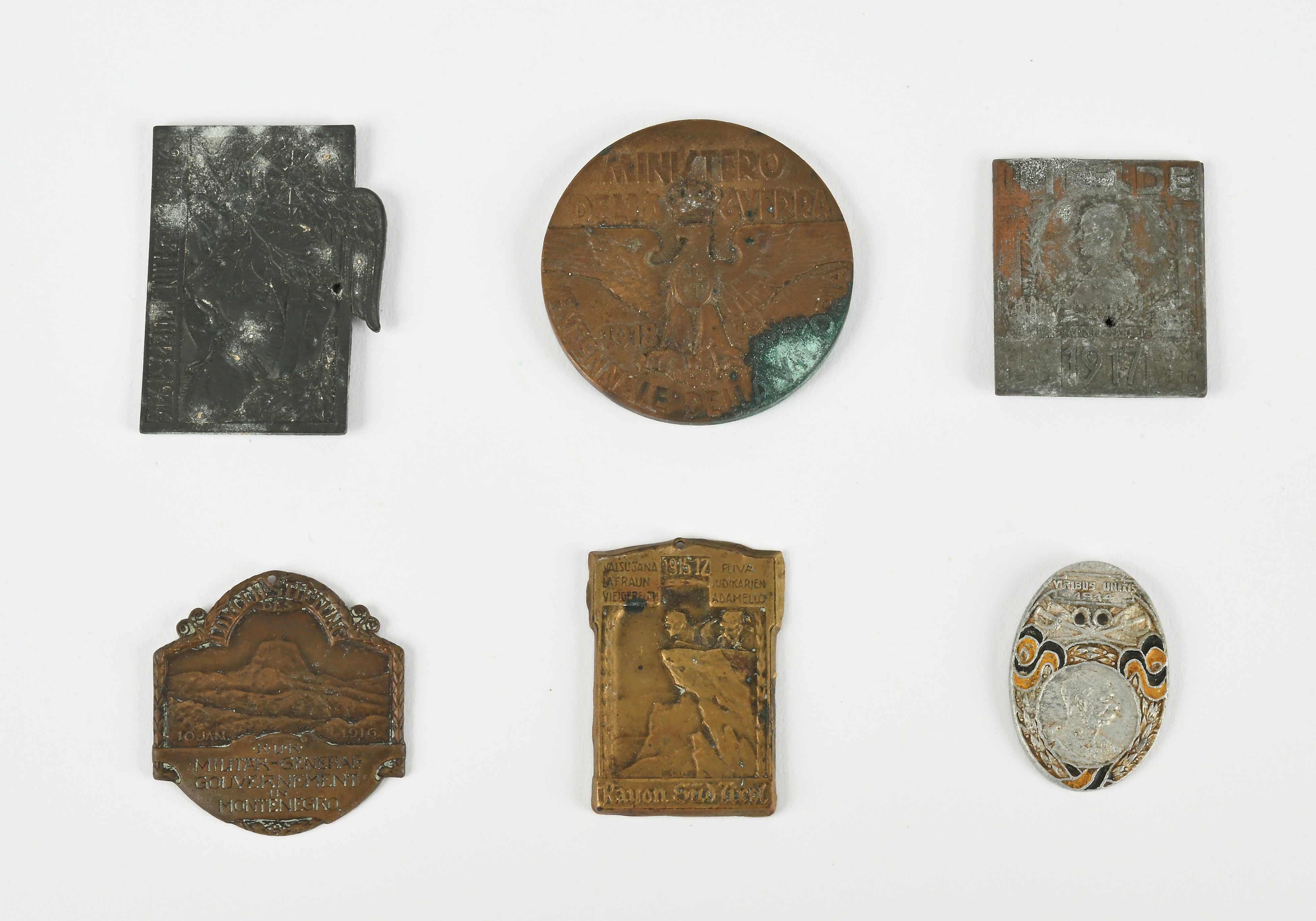 Lotto distintivi in metallo della Prima Guerra Mondiale e Medaglia in bronzo del Ministero della Guerra Decennale della Vittoria 1918-1938 Regno d'Italia