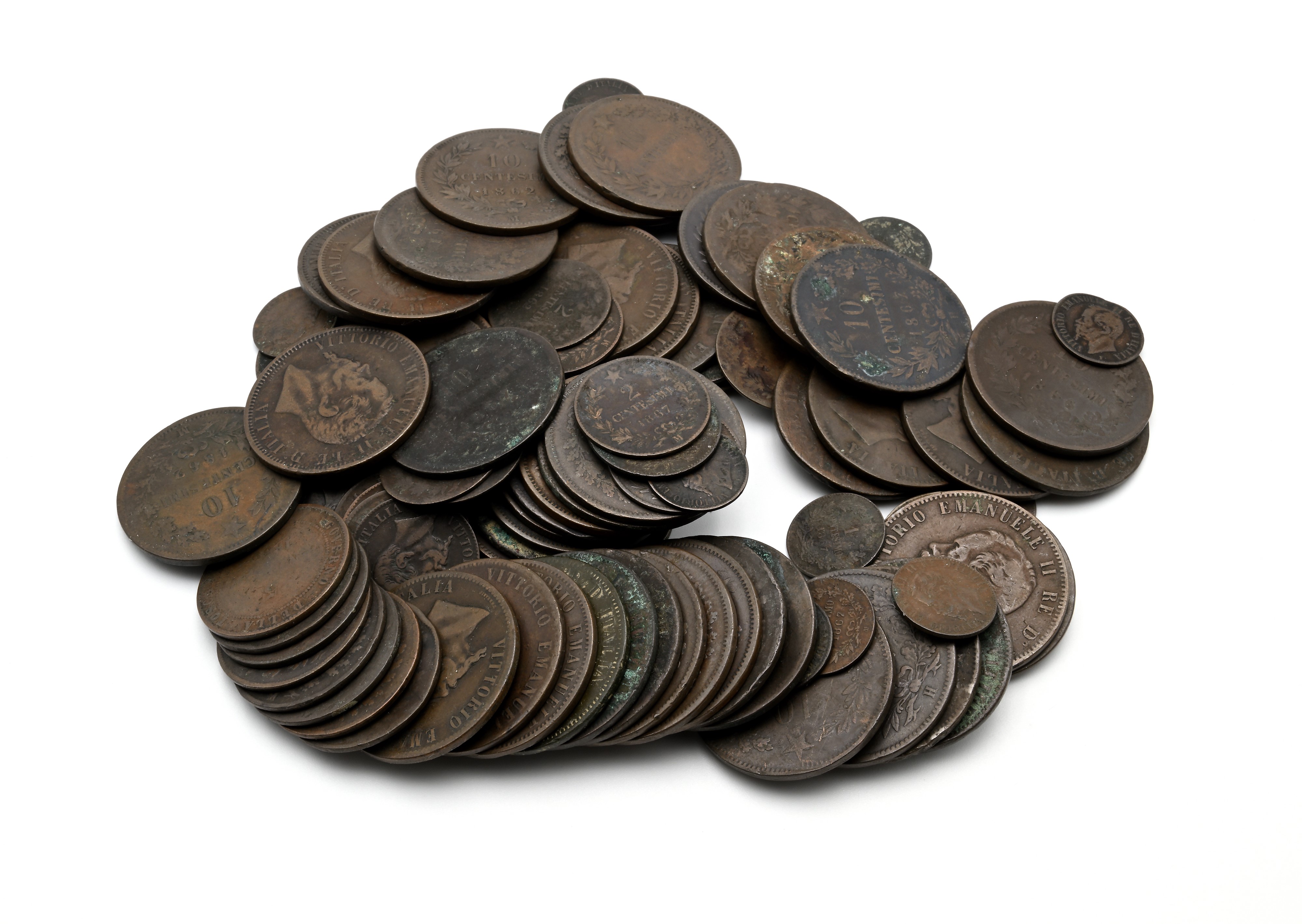 Lotto monete 10 Centesimi, 5 Centesimi, 2 Centesimi e 1 Centesimo Vittorio Emanuele II Re Eletto e Regno d'Italia. Medaglietta in bronzo 1860 Liberazione della Sicilia con Garibaldi "Ditattore"