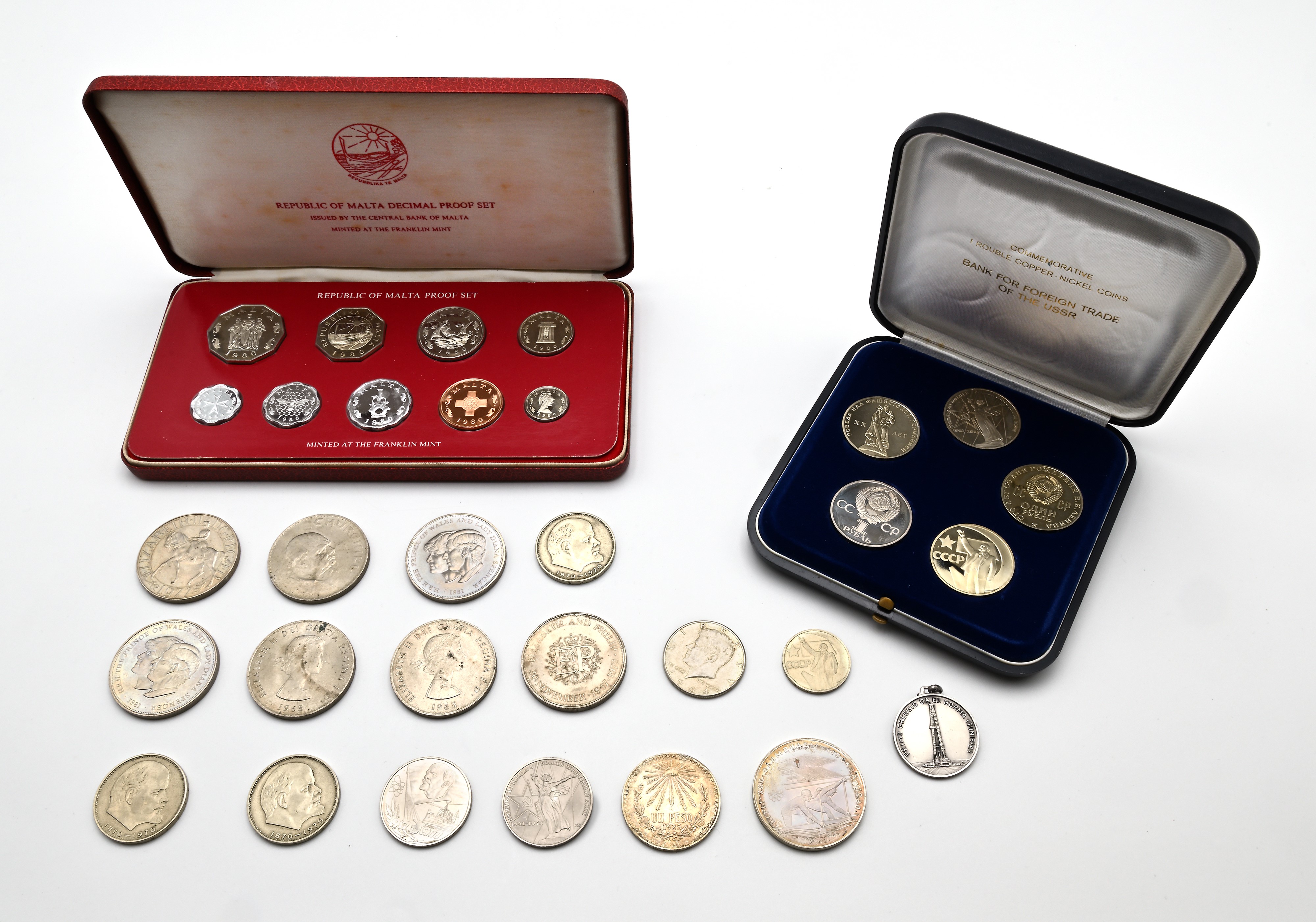 Lotto monete: 10 Rubli 1978 e serie Rublo Proof U.R.S.S., 1/2 Dollaro 1964 U.S.A., Gran Bretagna, Serie Proof 1980 Malta; Peso 1925 Messico e 1 medaglietta Agip Ancona