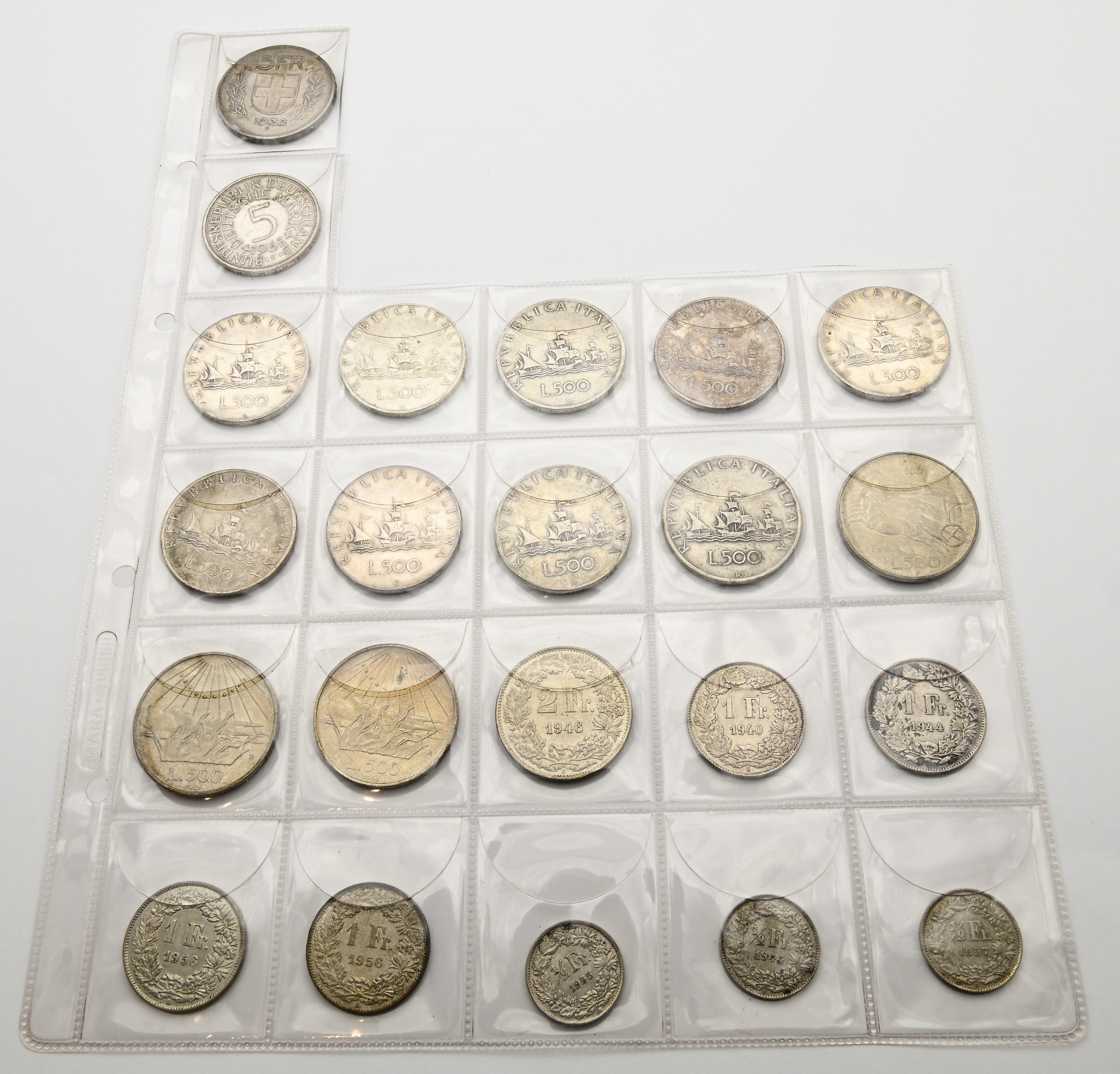 Lotto monete: 12 pezzi da 500 Lire Repubblica Italiana; 5 Franchi Svizzeri; 5 Marchi, 2 Franchi Svizzeri; 4 pezzi da 1 Franco Svizzero; 3 pezzi da 0,50 Franchi Svizzeri